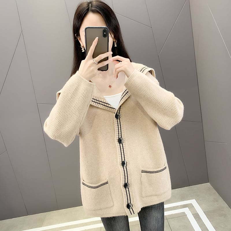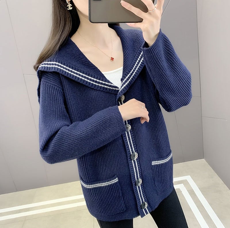 大人女性にぴったりの大きめ襟のVネックリブニットカーディガン。