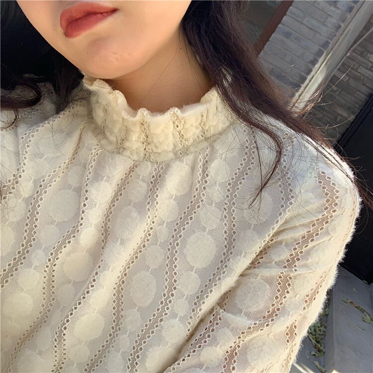 ドット柄 パンチングレース 長袖 ブラウス トップス インナー ミディアム丈 袖あり 襟付き スタンドカラー レース フリル 透け感 かわいい 大人可愛い きれいめ シンプル カジュアル 大人 上品 おしゃれ お洒落 レトロ 大人女子 ラブリー キュート ガーリー ルーズ 柄 水玉 春 秋 冬 10代 20代 レディース 通勤 学生 通学 デート お出かけ 女子会 休日 旅行 着回し 普段使い 重ね着 韓国 韓国系 オルチャン ゆったり ゆる サイズ S M L 色展開 白 ホワイト