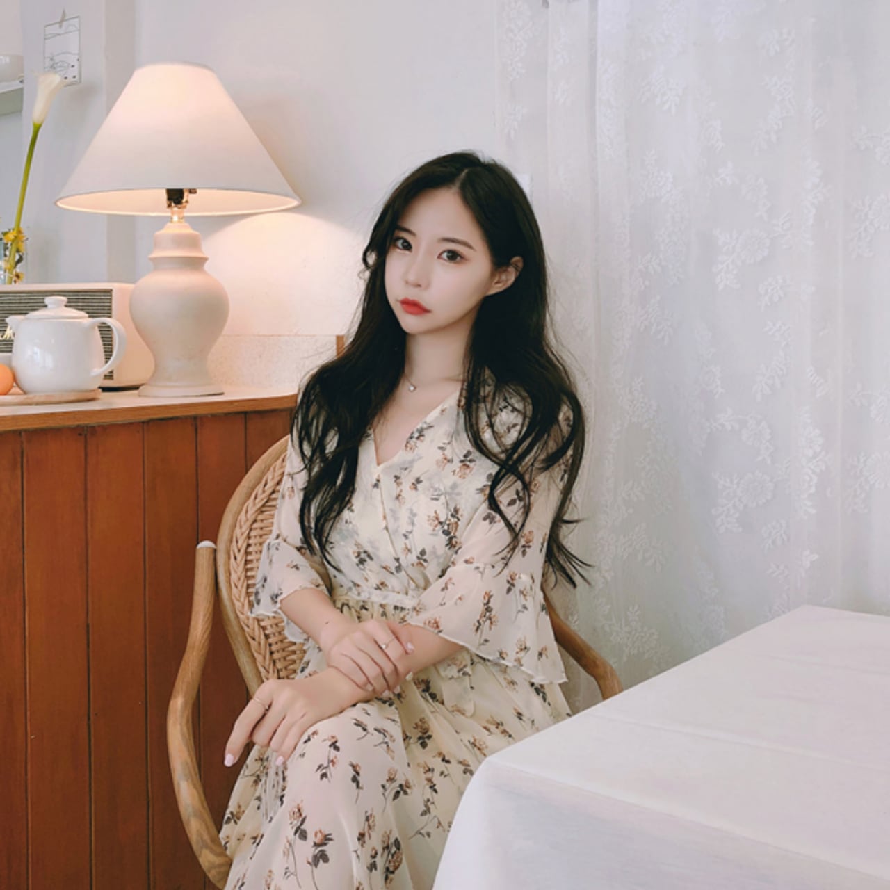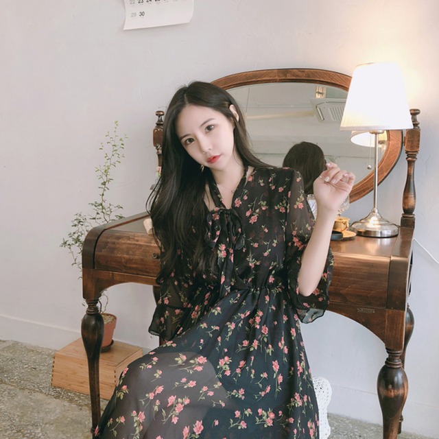 ワンピース ドレス レディース 花柄 花 妖精シフォンドレス 蓮の葉スリーブ ハイウエスト ロングスカート Vネック オフィス ビジネス OL 通勤 学生 通学 デート お出かけ 公園デビュー 女子会 お泊まり 休日 着回し 普段使い 重ね着 お揃い 双子 韓国 韓国系 オルチャン ファッション コーデ スタイル 楽ちん クリスマス バレンタイン こなれ感 定番 ラブリー キュート ガーリー ルーズ 個性的 セクシー インスタ映え アプリコット ブラック オールシーズン 春 夏 秋 冬 S M L XL