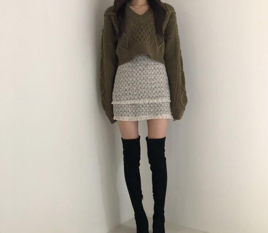 とろみ感溢れるニット×フリンジスカートの組み合わせ。