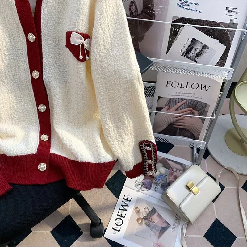 パール ボタン ビジュー リボン 長袖 ニット カーディガン トップス ミディアム丈 袖あり ラウンドネック 襟なし もこもこ モコモコ ふわふわ かわいい 大人可愛い カジュアル 大人 おしゃれ お洒落 大人女子 ラブリー キュート ガーリー ルーズ 個性的 主役級 存在感 無地 春 秋 10代 20代 レディース 通勤 学生 通学 デート お出かけ 女子会 休日 旅行 着回し 普段使い 重ね着 韓国 ゆったり ゆる バイカラー 大きいサイズ S M L XL 2XL 色展開 赤 レッド オフホワイト
