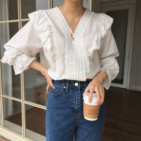 フリルブラウス トップス シャツ ブラウス 袖あり 長袖 Vネック レース フリル かわいい 大人可愛い きれいめ シンプル カジュアル 大人 上品 おしゃれ お洒落 大人可愛い 大人女子 こなれ感 ラブリー キュート ガーリー エレガント モダン 主役級 存在感 無地 春 秋 10代 20代 30代 レディース OL 通勤 学生 通学 デート 女子会 お泊まり 着回し 普段使い 重ね着 韓国系 オルチャン サイズ S M L XL 色展開 白 ホワイト