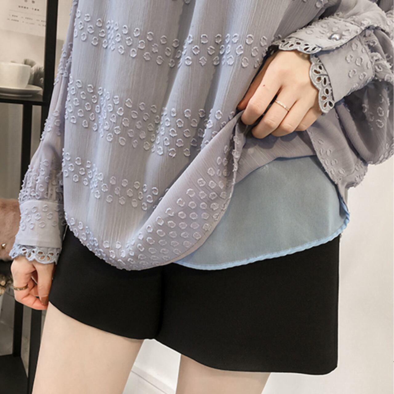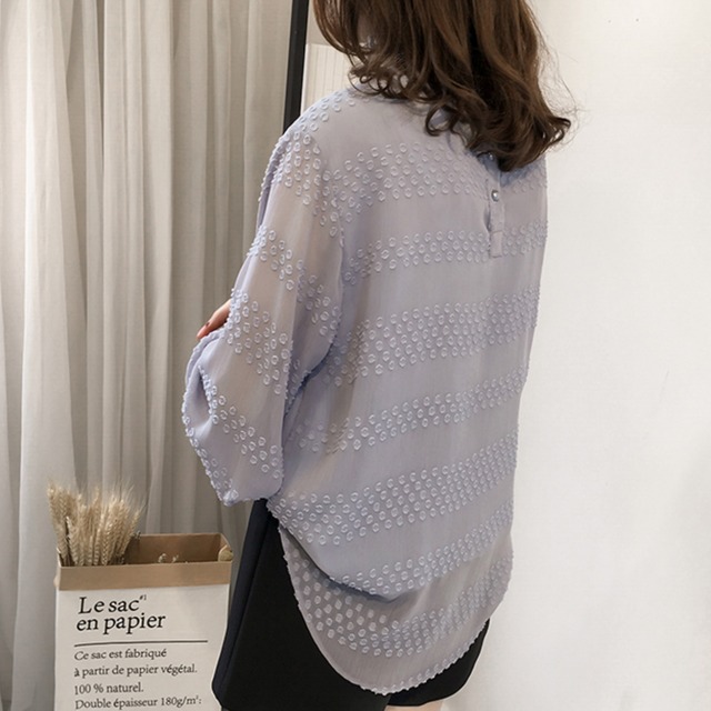 プラスサイズの女性にもおすすめの、後ろボタンがお洒落なランタンスリーブシフォンシャツ。