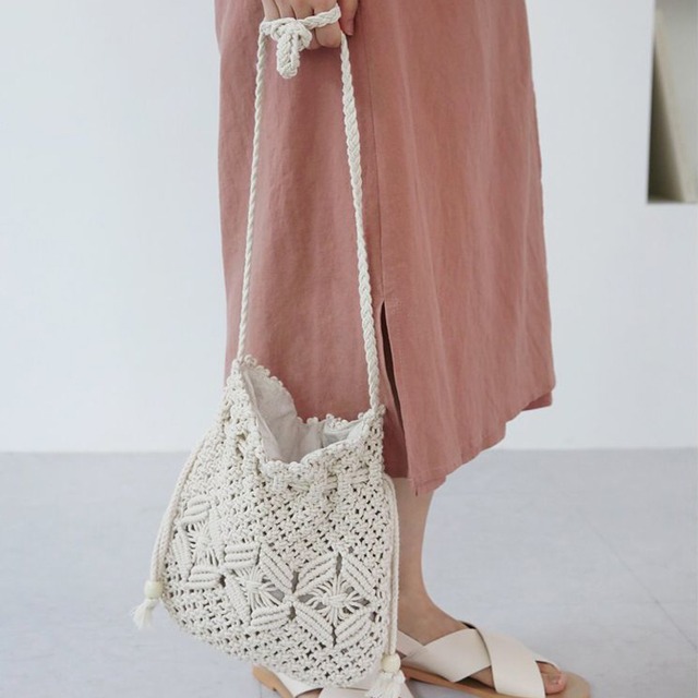 ナチュラルな雰囲気が魅力の、手編みの綿糸バッグ。