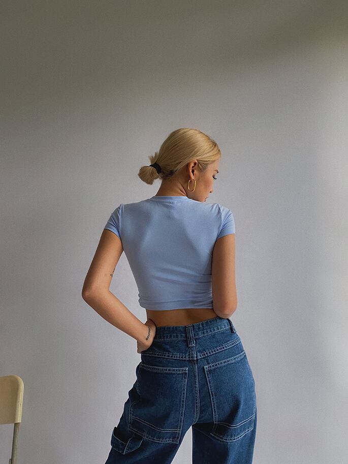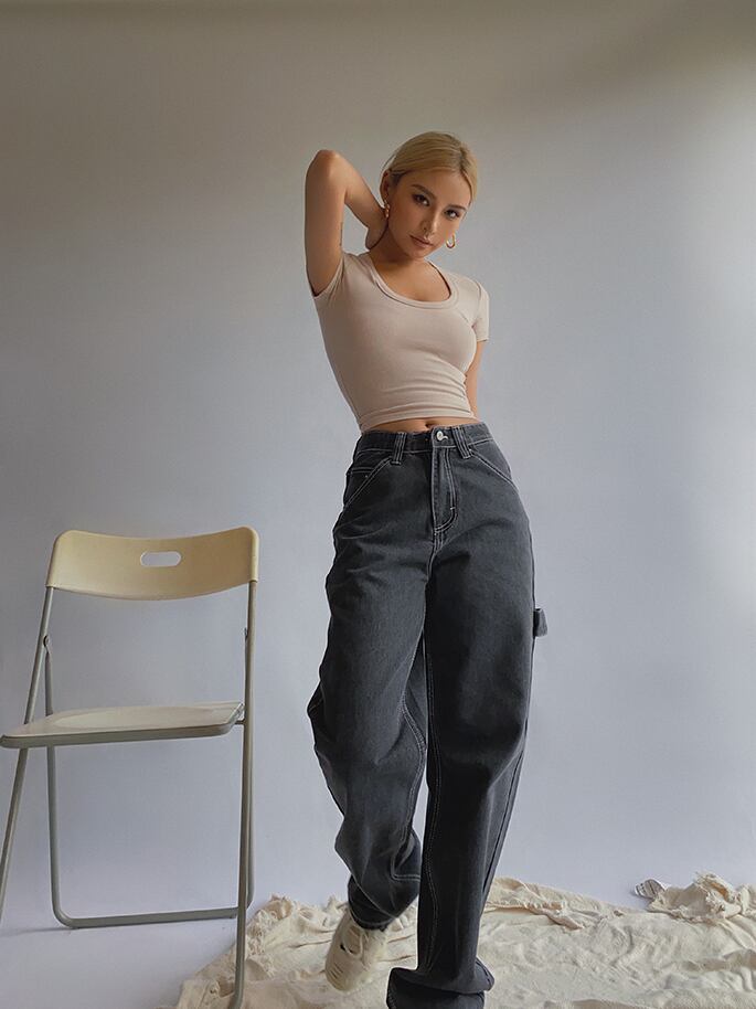 ハイウエストのストレートレッグワイドレッグジーンズ。