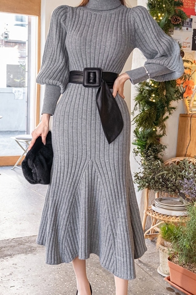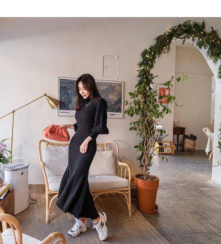 ゆったりしたランタンスリーブのタートルニットワンピース。