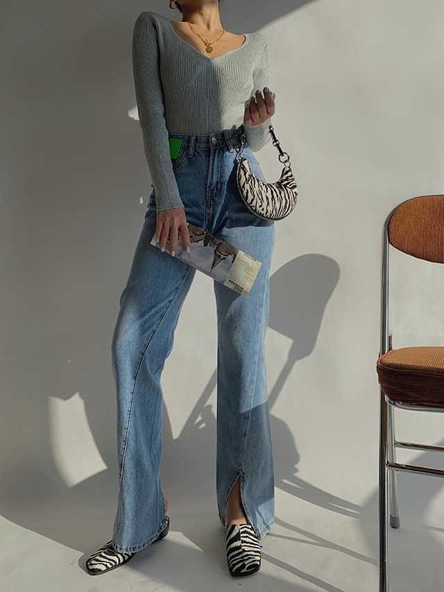 斜め前立てがエッジィな印象を与える、ハイウエストで脚長効果抜群のスリムストレートレッグデニムパンツです。