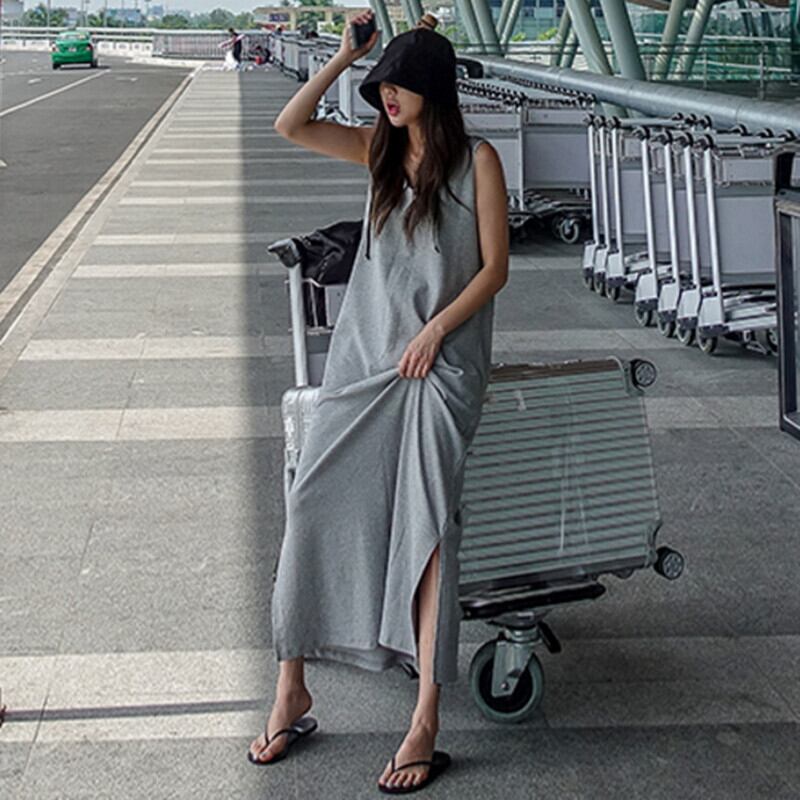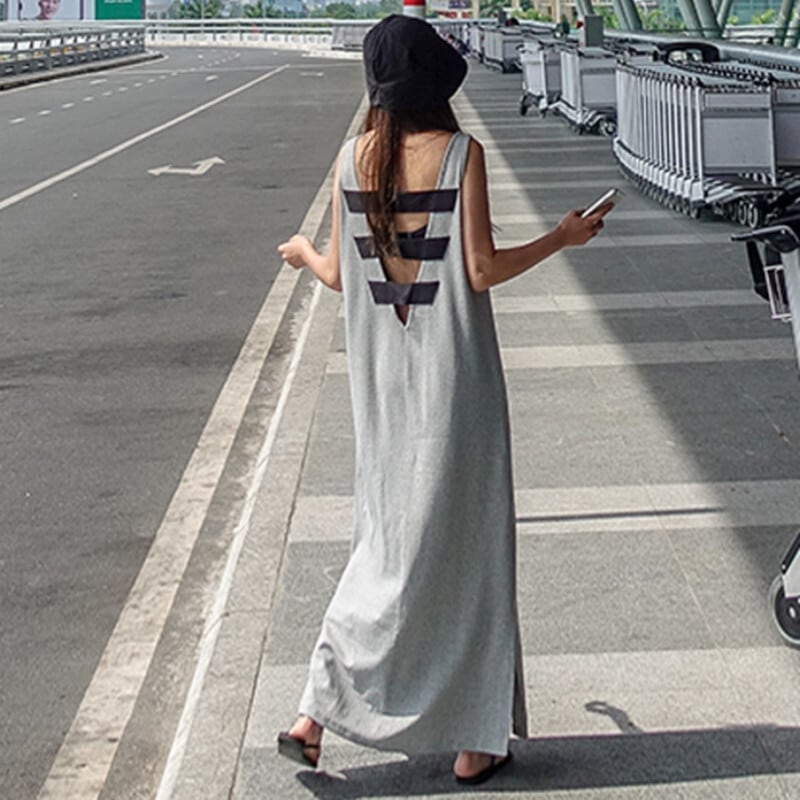 ワンピース ロングスカート ロング丈 ノースリーブ Uネック ストレート サイドスリット バックレス かわいい きれいめ シンプル カジュアル セクシー ラフ 個性的 無地 夏 10代 20代 レディース デート お出かけ ファッション サイズ S M L XL グレー