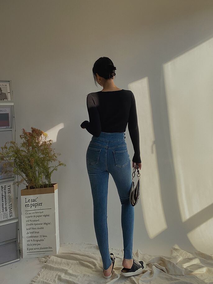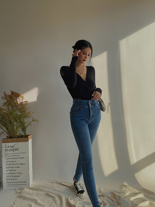 スリムフィットで体のラインを美しく引き立て、深いVネックが大胆な抜け感を演出します。