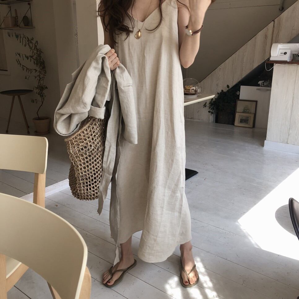 爽やかなワンピースが登場!Vネックのキャミソールデザインで、女性らしい肌見せが叶います。リラックス感たっぷり。ロングスカートの丈感が大人っぽくきれいめな印象に。