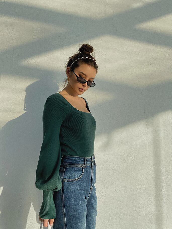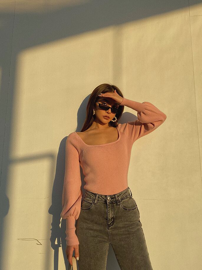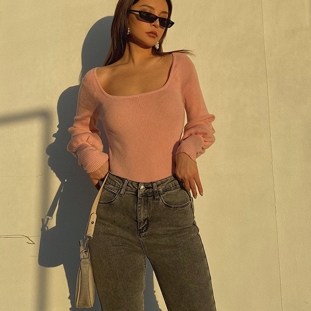洗練されたヨーロッパとアメリカのデザインが光る、セクシーな鎖骨見せロースクエアネックセーター。