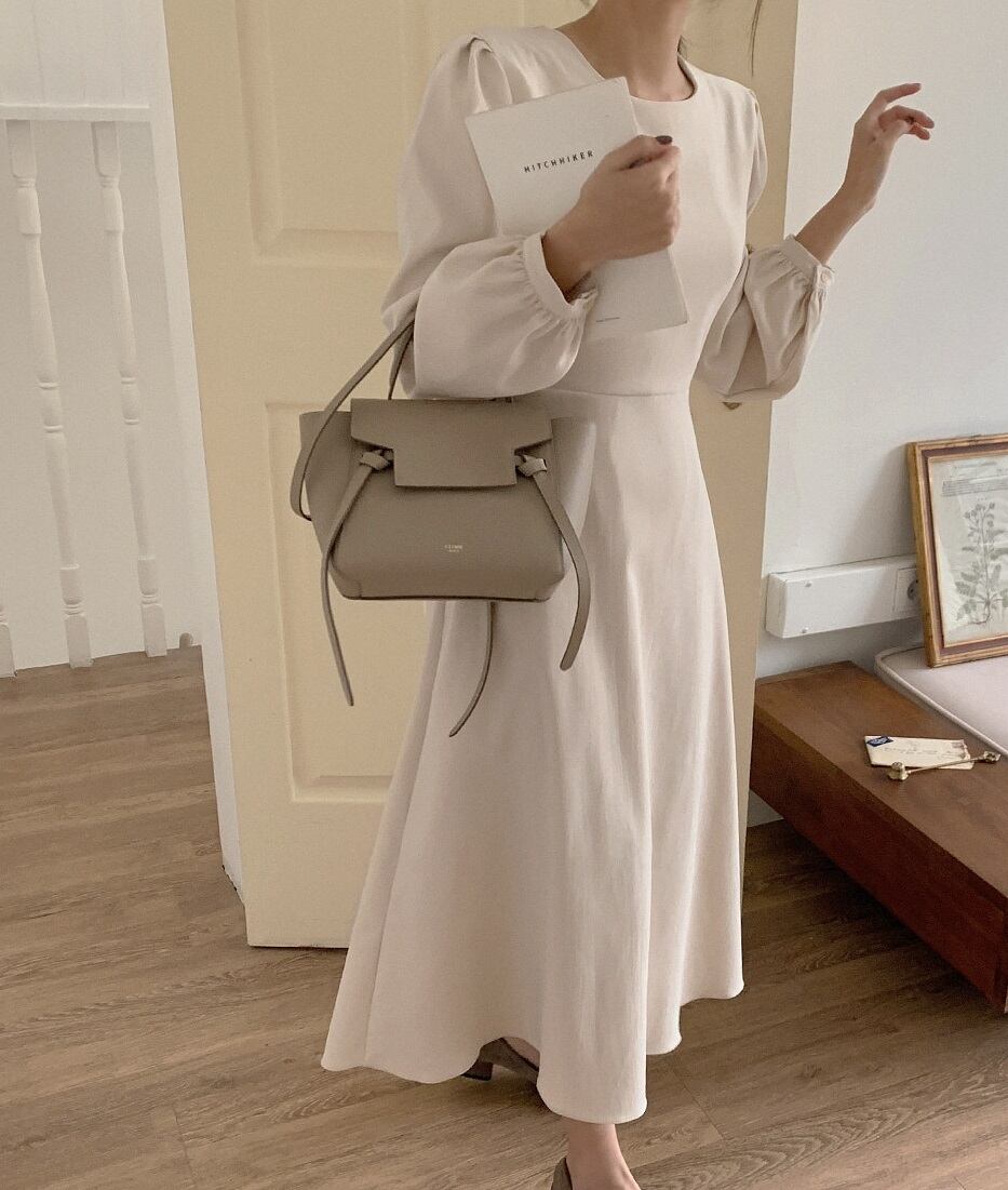 ミモレ丈 バックリボン フレアワンピース ワンピース ワンピドレス 膝下 ミモレ 袖あり 長袖 パフスリーブ ラウンドネック 襟なし リボン かわいい 大人可愛い きれいめ シンプル 大人 上品 おしゃれ お洒落 大人女子 エレガント 無地 春 秋 20代 30代 40代 レディース ママ 通勤 通学 デート お出かけ 女子会 休日 旅行 着回し 普段使い 重ね着 韓国 楽ちん サイズ S M L XL 色展開 オフホワイト