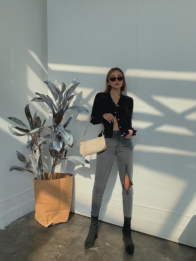 ハイウエストとスリムなVネックの組み合わせは、女性らしさを際立たせ、曲線美を美しく強調してくれます。