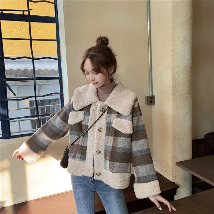 アウター ショート丈 長袖 襟付き ストレート もこもこ モコモコ 前開き かわいい カジュアル おしゃれ お洒落 レトロ ガーリー チェック柄 冬 10代 20代 レディース デート お出かけ ファッション フリーサイズ グレー