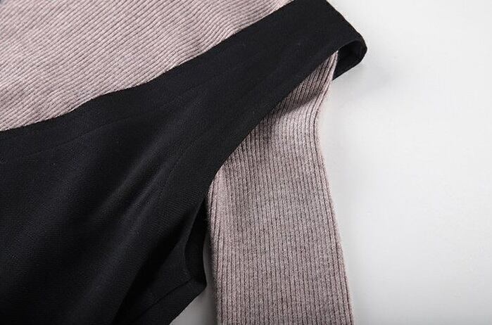 深めのVネックで顔周りをすっきりとみせてくれるジャンパースカートとニットのセットアイテム。