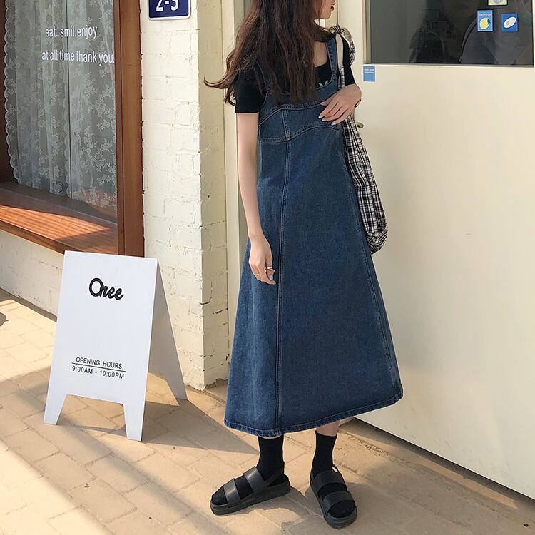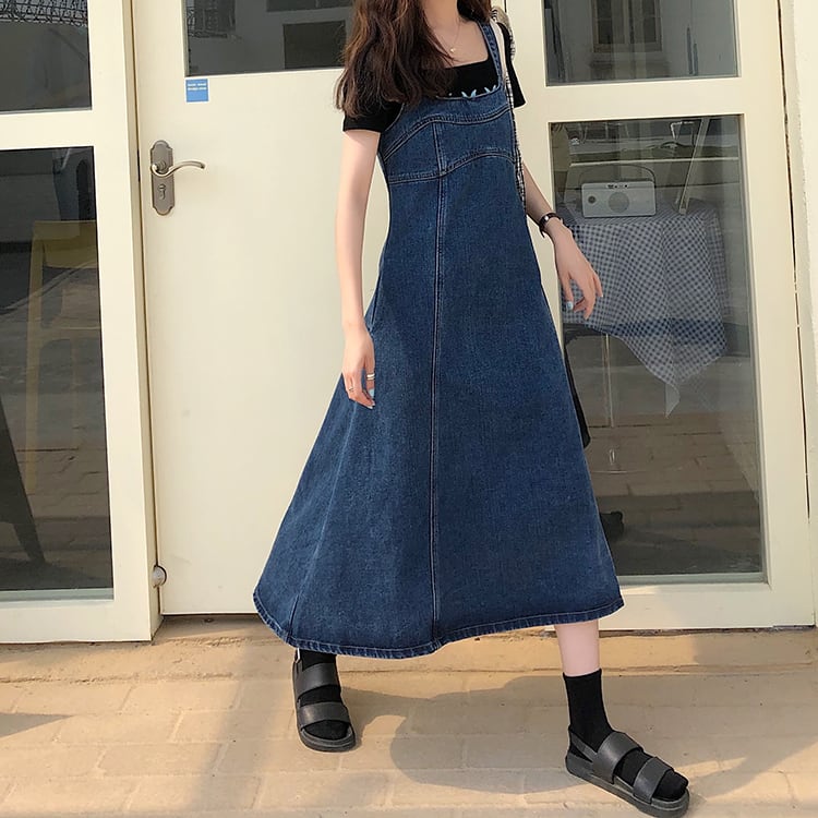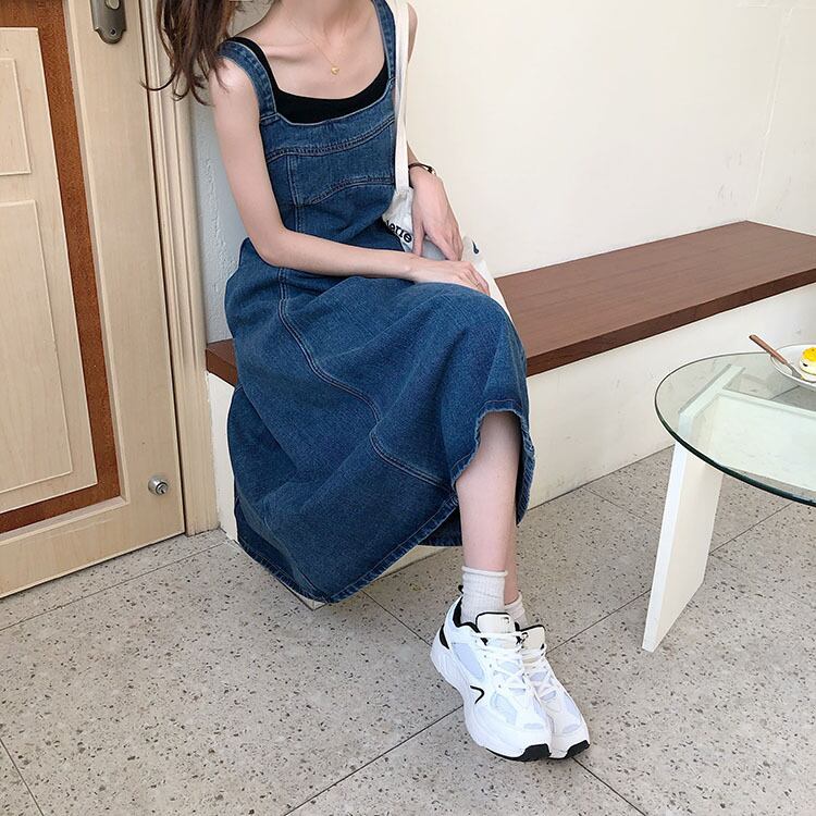 ジャンパースカート ミディ丈 袖なし 襟なし Aライン デニム ブルーデニム かわいい 大人可愛い きれいめ シンプル カジュアル 大人 上品 おしゃれ お洒落 かっこいい 大人女子 こなれ感 ラフ ラブリー キュート ガーリー 個性的 主役級 存在感 無地 春 夏 秋 10代 20代 レディース 女性用 デート お出かけ 女子会 お泊まり 休日 旅行 着回し 普段使い 重ね着 インスタ映え サイズ S M L 色展開 ネイビー 紺