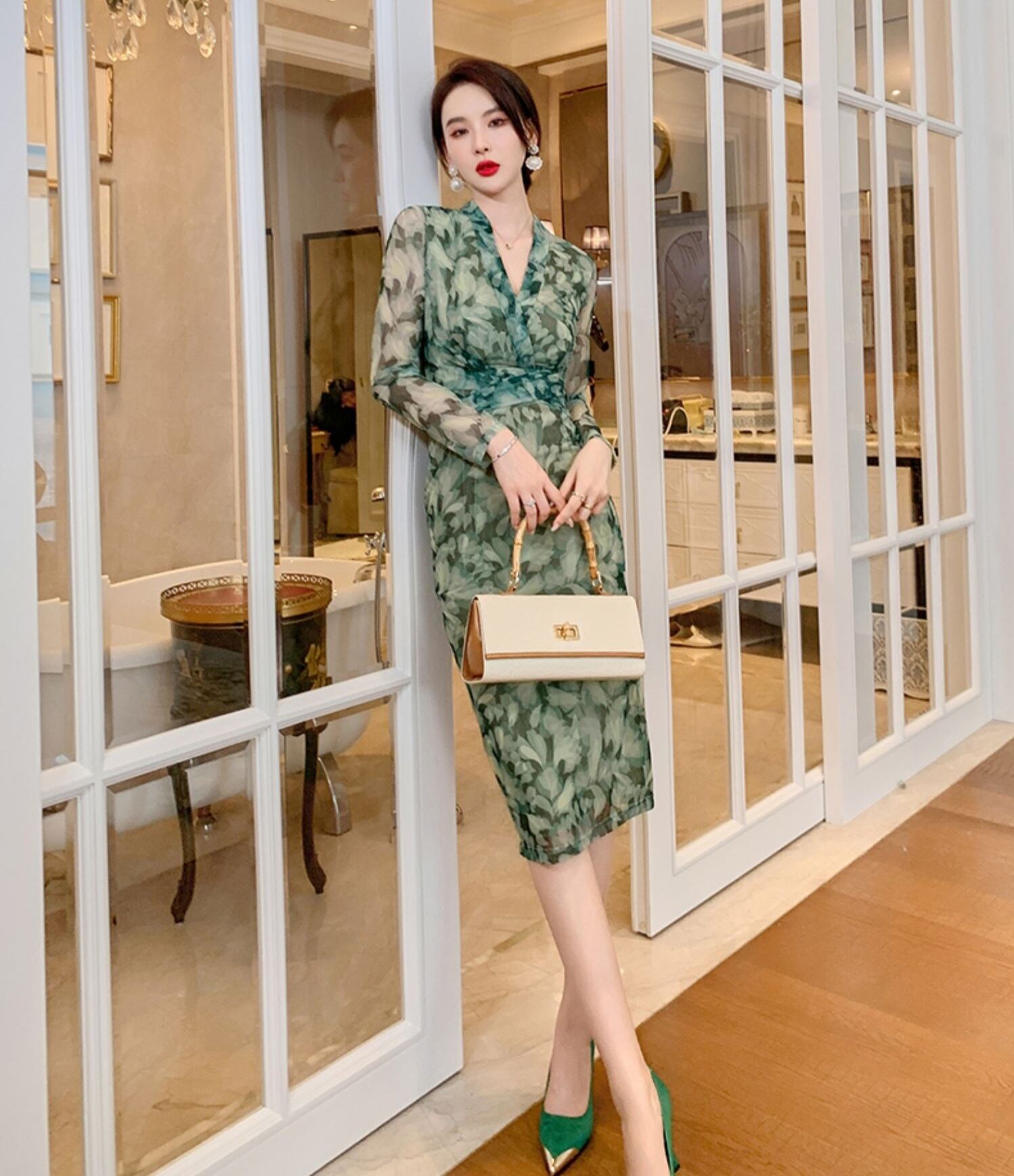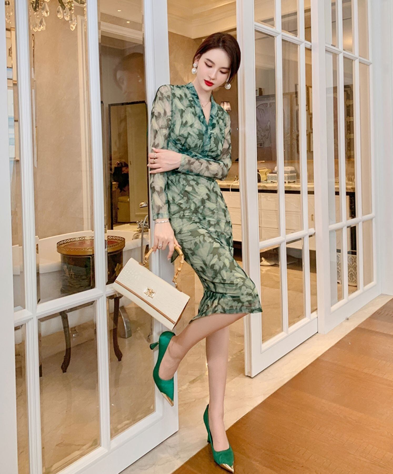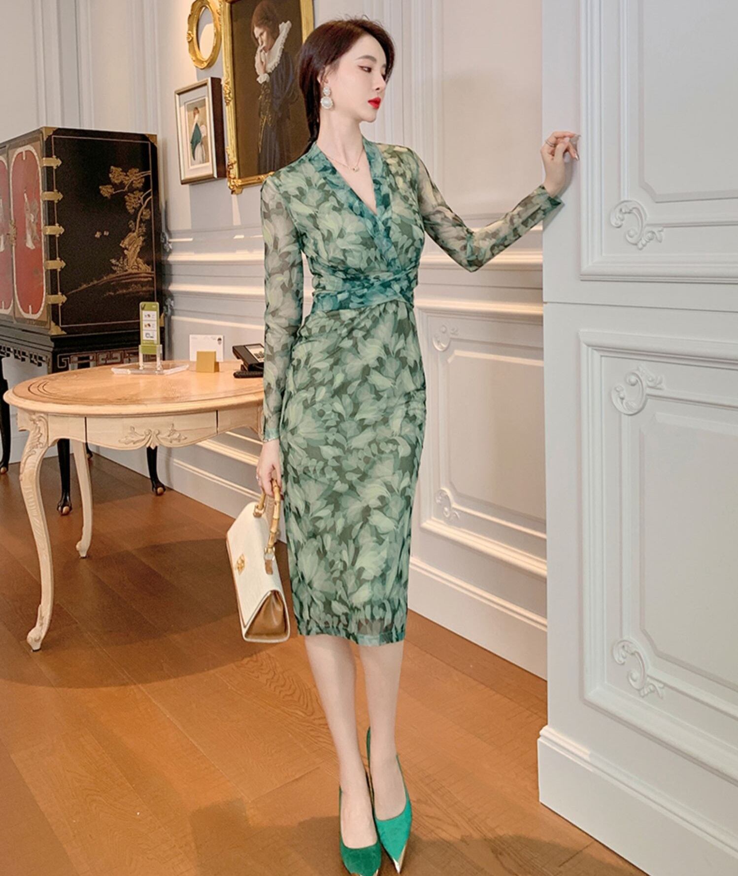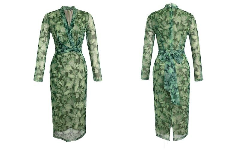長袖 Vネック 膝丈 ワンピース ワンピドレス ひざ丈 袖あり カシュクール 襟なし スリム 細身 切り替えデザイン ハイウエスト 透け感 シースルー かわいい 大人可愛い きれいめ 大人 上品 おしゃれ お洒落 大人女子 エレガント 存在感 柄 リーフ柄 春 秋 20代 30代 40代 レディース 通勤 学生 通学 デート お出かけ 女子会 休日 旅行 着回し 普段使い 重ね着 韓国 楽ちん サイズ S M L XL 色展開 緑 グリーン