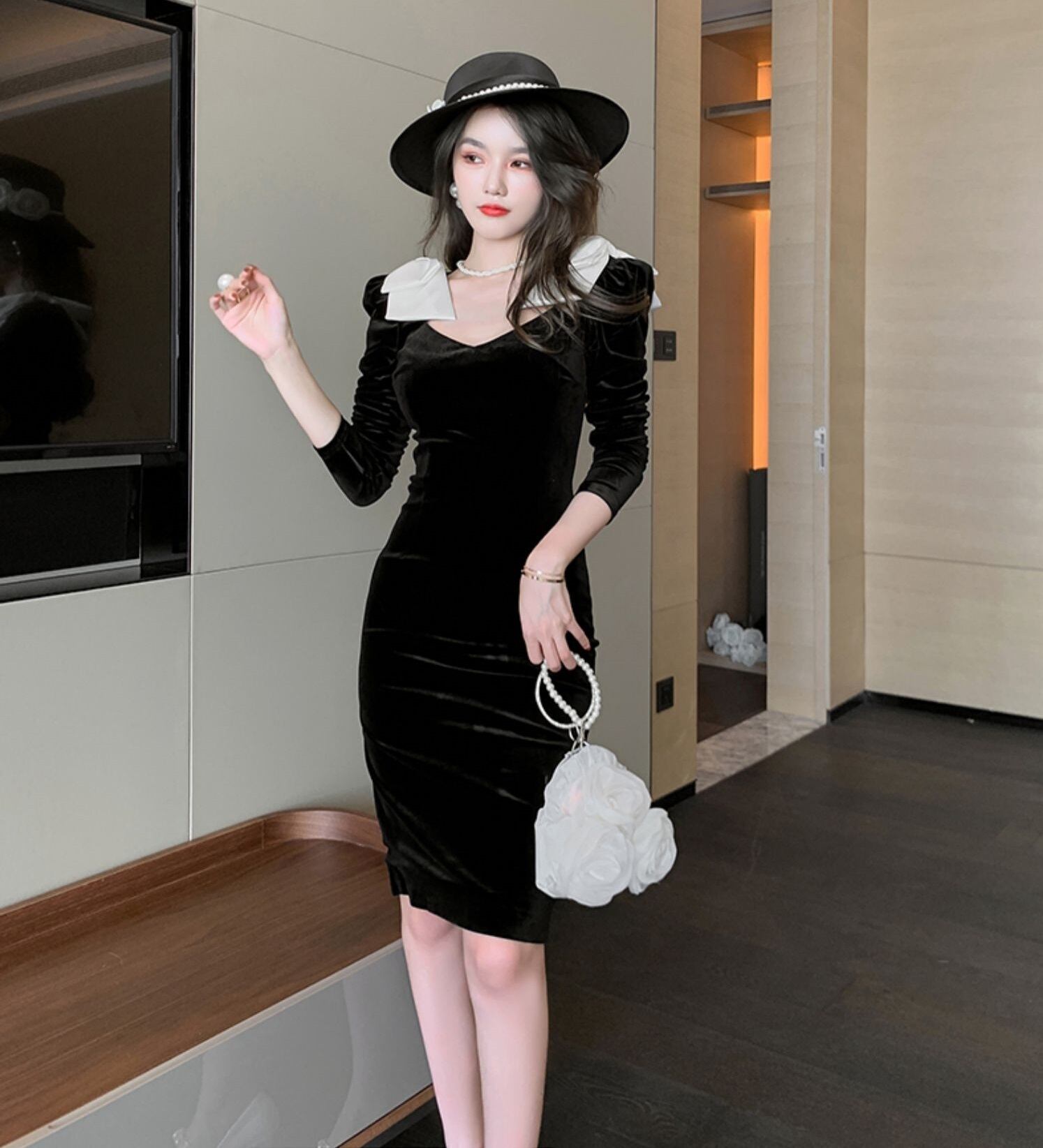 肩の大きめリボン付きベロアワンピースで、大人女子らしい上品なスタイルを演出しましょう!