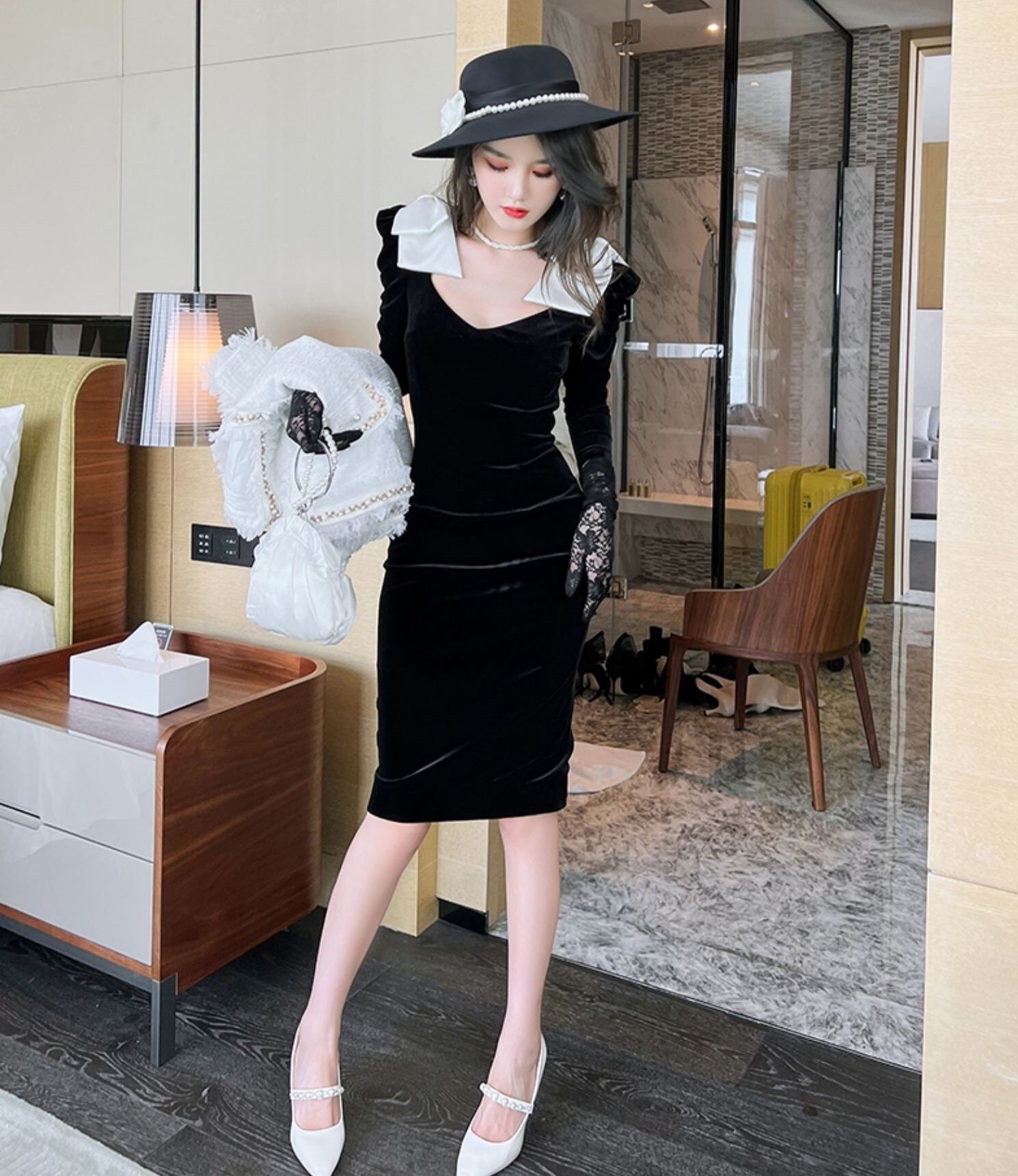 リボン付き ベロア 長袖 Vネック ワンピース ドレス ワンピドレス 膝丈 ひざ丈 袖あり 襟付き スリム 細身 リボン ベルベット かわいい 大人可愛い きれいめ シンプル カジュアル 大人 上品 おしゃれ お洒落 大人女子 エレガント 無地 春 秋 冬 10代 20代 30代 レディース 通勤 学生 通学 デート お出かけ 女子会 休日 旅行 着回し 普段使い 重ね着 韓国 楽ちん モノトーン バイカラー サイズ M L 色展開 黒 ブラック