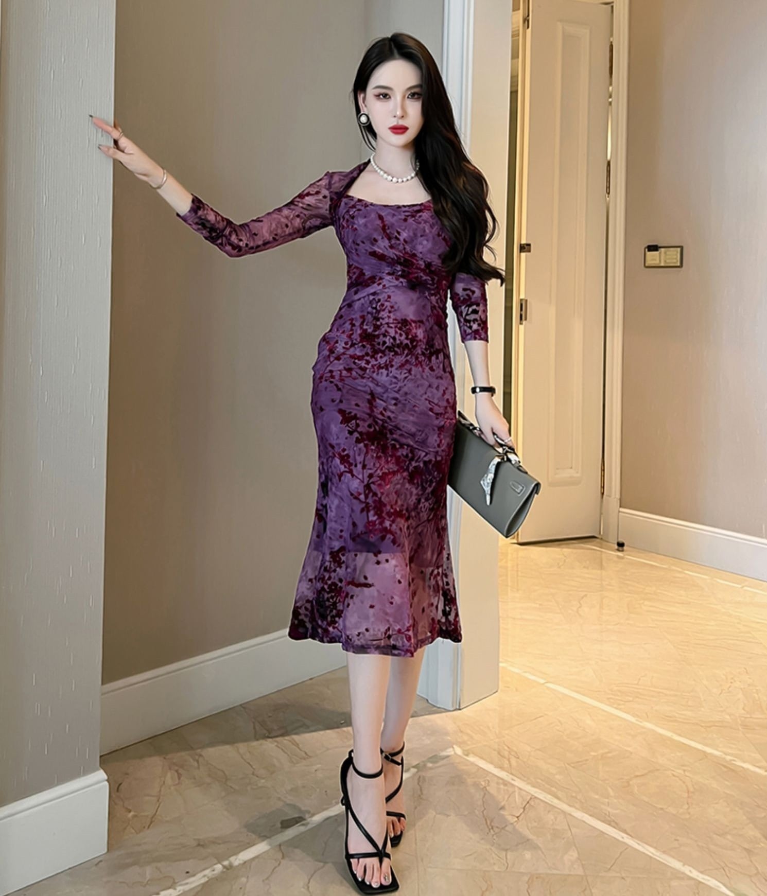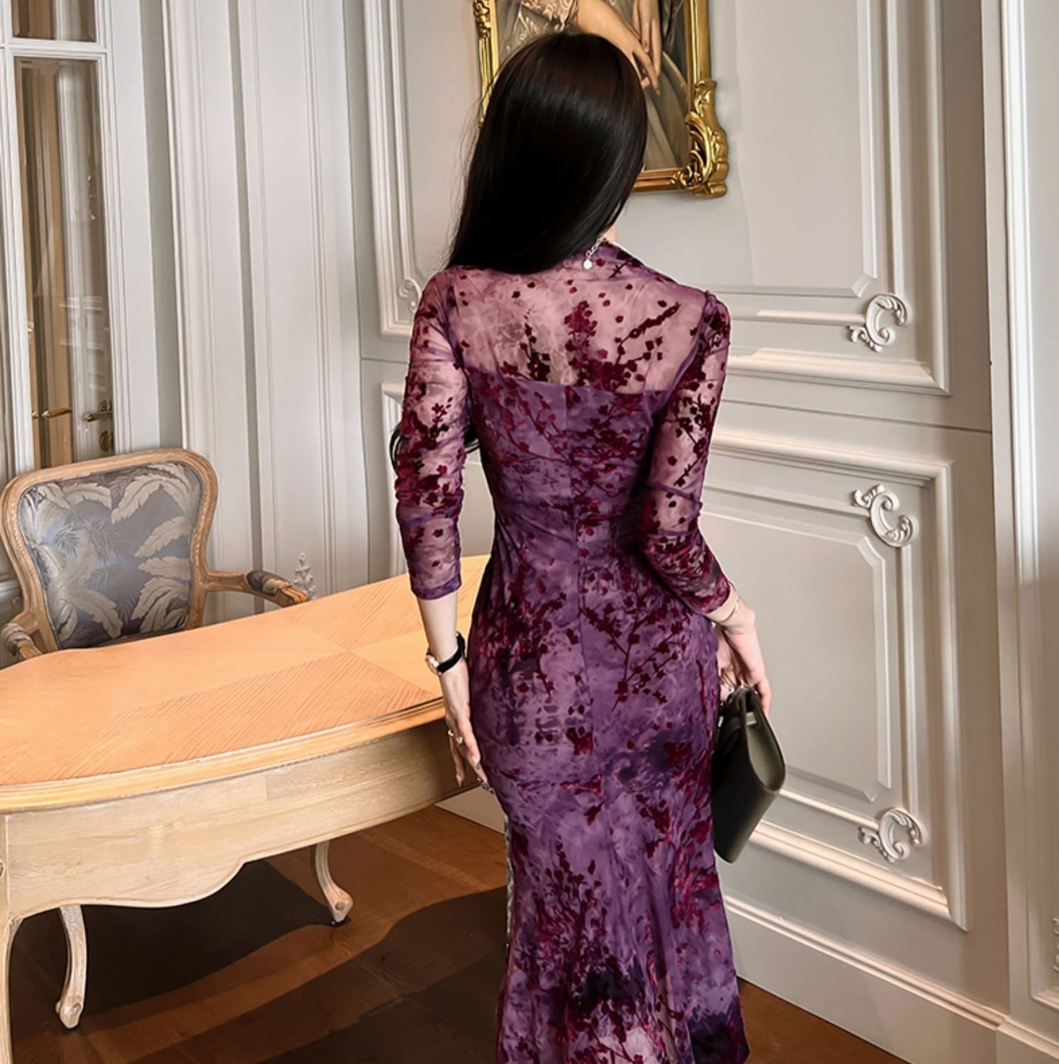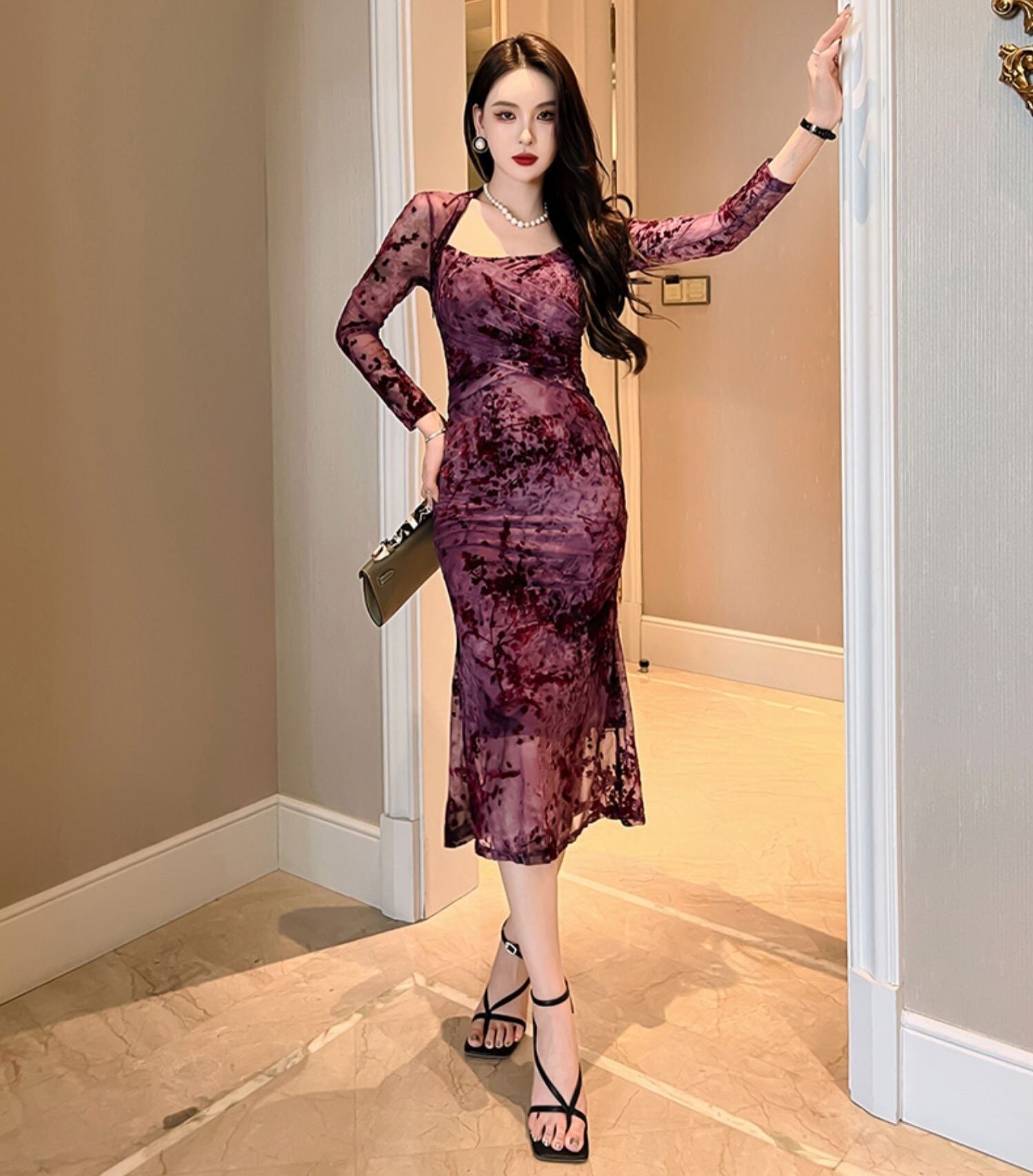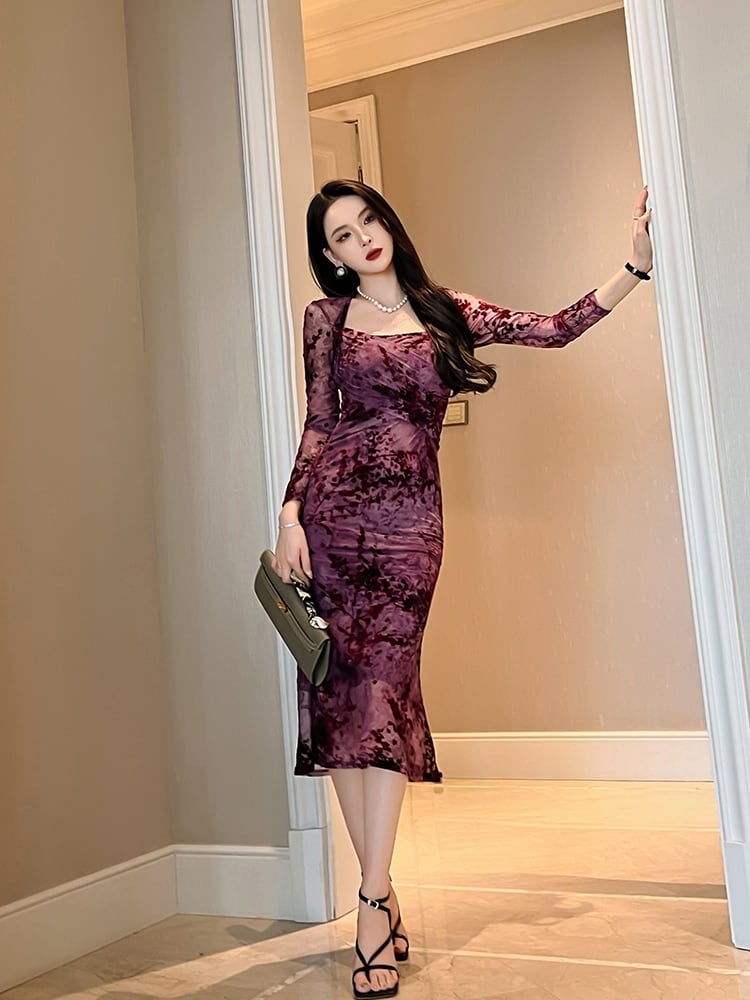花柄 レース マーメイド ワンピース ドレス ワンピドレス 膝下 ミモレ ミモレ丈 袖あり 長袖 襟なし フレア スリム 細身 ハイウエスト 透け感 シースルー かわいい 大人可愛い きれいめ 大人 上品 おしゃれ お洒落 大人女子 セクシー エレガント 主役級 柄 小花柄 フラワー 春 秋 10代 20代 30代 レディース 通勤 学生 通学 デート お出かけ 女子会 休日 パーティー 旅行 着回し 普段使い 韓国 楽ちん 流行 サイズ S M L XL 色展開 紫 パープル
