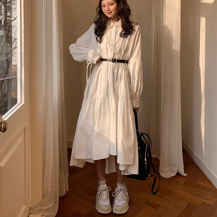 ワンピース シャツワンピース ロングワンピース ロング 袖あり 長袖 襟付き ティアード かわいい 大人可愛い シンプル カジュアル フェミニン おしゃれ お洒落 おとな ナチュラル こなれ感 ラフ ラブリー キュート ガーリー ルーズ 個性的 レトロ 抜け感 無地 学生 通学 デート お出かけ 女子会 休日 旅行 フリーサイズ ホワイト 春 秋 冬 10代 20代 30代 40代 ママ 女性用 韓国 韓国系 着回し 普段使い 重ね着 体型カバー 定番 ファッション コーデ スタイル プチプラ モテ 流行