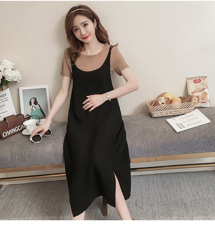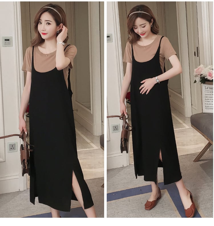 マタニティ ワンピース セットアップ Tシャツ 白トップス ロング丈 半袖 Uネック Aライン サイドスリット かわいい シンプル カジュアル 無地 夏 20代 30代 レディース お出かけ ファッション サイズ M L XL 2XL ゆったり 色展開 ホワイト ブラウン