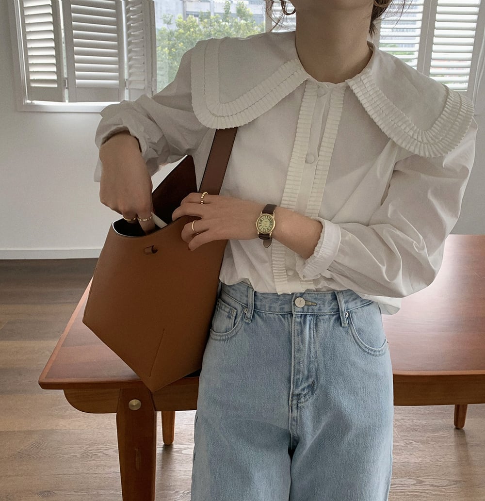 トップス シャツ ブラウス 袖あり 長袖 襟付き ビッグカラー 丸襟 プリーツ かわいい 大人可愛い きれいめ シンプル カジュアル フェミニン おしゃれ お洒落 おとな こなれ感 ラフ 個性的 レトロ 抜け感 無地 オフィス OL 通勤 学生 通学 デート お出かけ 女子会 休日 旅行 散歩 街歩き フリーサイズ ゆったり ホワイト ライトブルー 春 秋 冬 10代 20代 30代 40代 ママ 女性用 韓国 韓国系 着回し 普段使い 重ね着 体型カバー 定番 ファッション コーデ スタイル モテ 流行