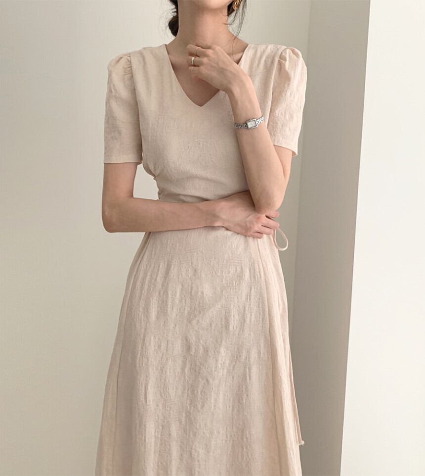 ワンピース 膝下 ミディアム丈 袖あり 半袖 Vネック ウエストマーク レースアップ かわいい 大人可愛い きれいめ シンプル カジュアル 上品 エレガント 清楚 フェミニン おしゃれ お洒落 おとな こなれ感 ガーリー 個性的 レトロ モダン 抜け感 華やか 無地 オフィス OL 通勤 学生 通学 デート お出かけ 女子会 休日 旅行 フリーサイズ アプリコット グレー 春 夏 10代 20代 30代 40代 ママ 女性用 韓国 韓国系 着回し 普段使い 体型カバー 定番 ファッション コーデ モテ