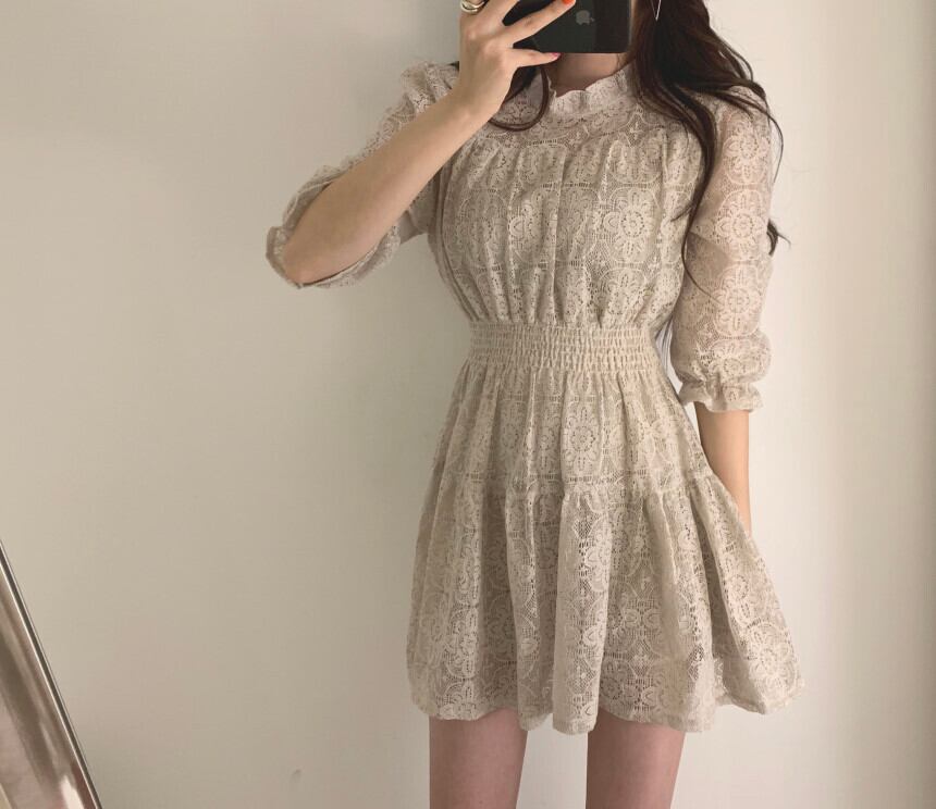ワンピース フレアワンピース ミニ ミニ丈 袖あり 5分袖 五分袖 フレア Aライン レース 刺繍 かわいい 大人可愛い きれいめ 上品 おしゃれ 花柄 小花柄 春 夏 10代 20代 デート お出かけ 着回し 普段使い 韓国系 オルチャン ファッション サイズ M 黒 ブラック ベージュ
