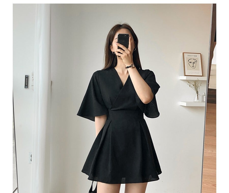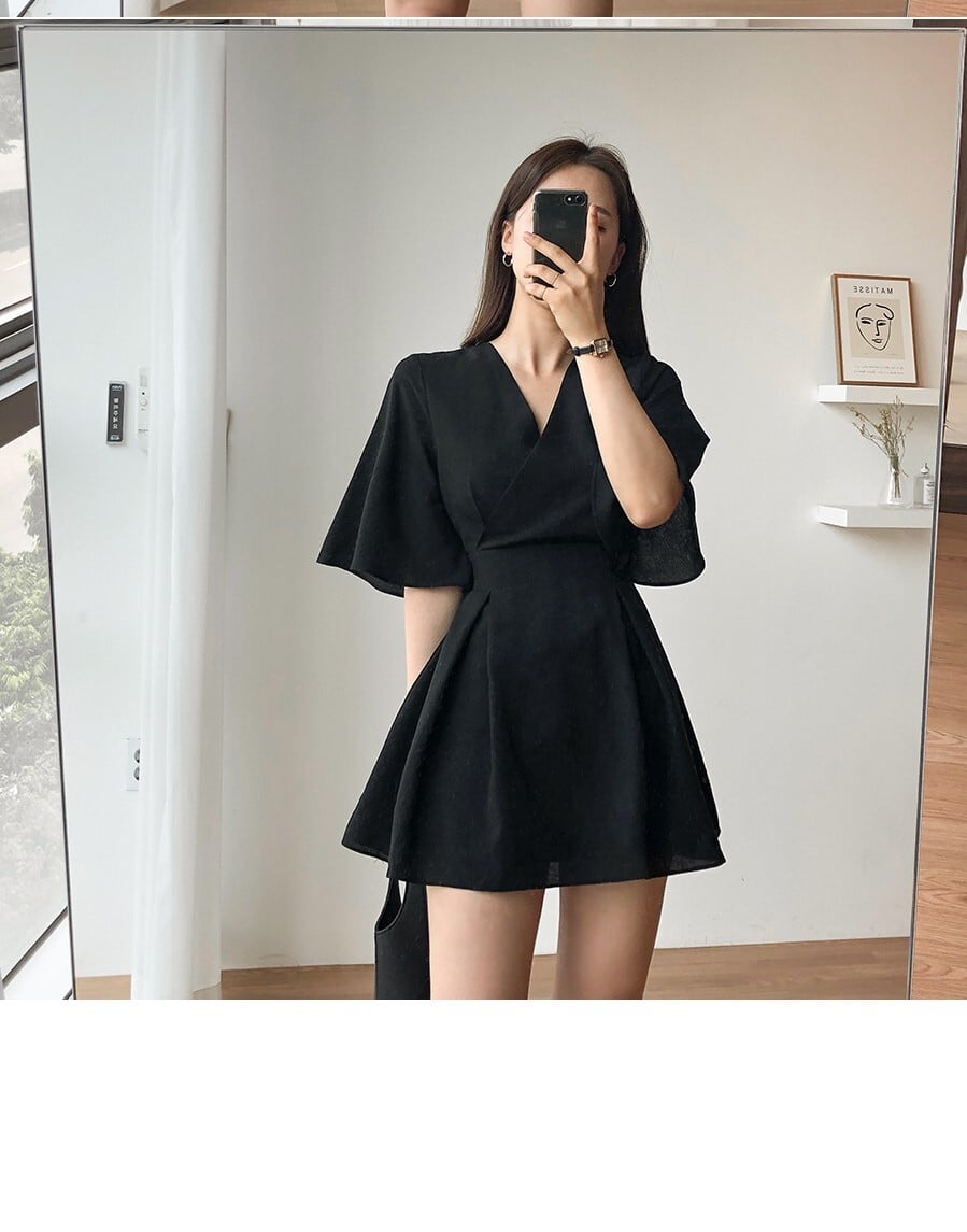 ワンピース フレアワンピース ミニ丈 袖あり 半袖 フレアスリーブ Vネック フレア Aライン かわいい 大人可愛い きれいめ シンプル カジュアル おしゃれ お洒落 無地 夏 10代 20代 30代 レディース デート お出かけ S M L 黒 ブラック 青 ブルー ベージュ