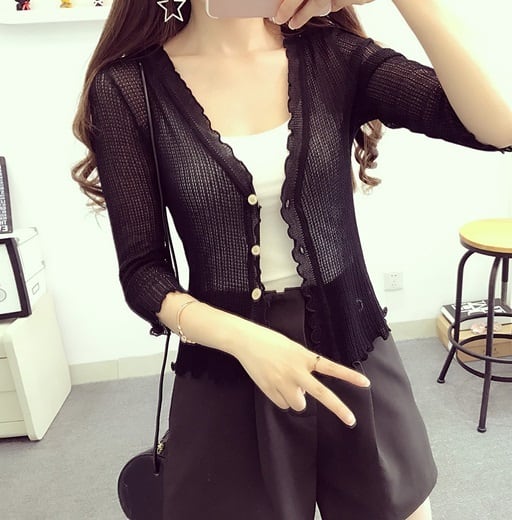 トップス カーディガン ショート丈 袖あり 7分袖 七分袖 Vネック 透かし編み ニット かわいい 大人可愛い きれいめ シンプル カジュアル 大人 おしゃれ お洒落 大人女子 ラブリー キュート ガーリー 個性的 主役級 存在感 無地 春 夏 10代 20代 30代 40代 レディース 女性用 ママ OL 通勤 学生 通学 デート お出かけ 女子会 お泊まり 休日 旅行 重ね着 韓国 モテ プチプラ フリーサイズ ブラック パープル