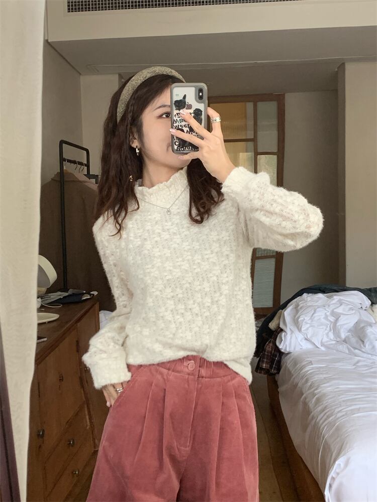 モコモコハイネックニット トップス ニットソー 白トップス 袖あり 長袖 ハイネック もこもこ モコモコ ニット かわいい シンプル 上品 おしゃれ お洒落 大人可愛い ラブリー キュート ガーリー 柄 秋 冬 10代 20代 レディース デート お出かけ 女子会 韓国系 オルチャン ファッション S M L 白 ホワイト