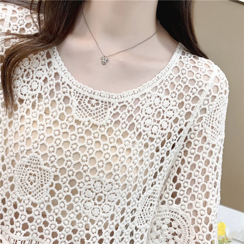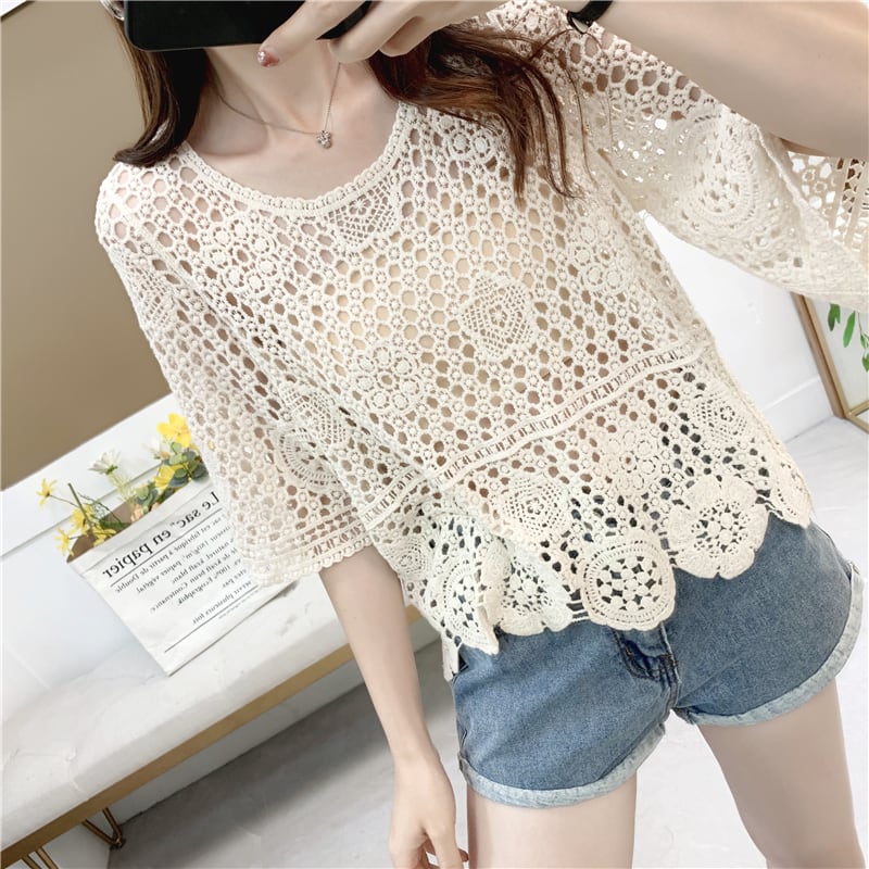 トップス プルオーバー ミニ丈 ショート丈 袖あり 五分袖 ラウンドネック 透け感 透かし編み かわいい 大人可愛い シンプル カジュアル おしゃれ お洒落 レトロ 大人女子 こなれ感 ラフ 個性的 主役級 存在感 抜け感 無地 春 夏 10代 20代 30代 40代 レディース 女性用 ママ 学生 通学 デート お出かけ 女子会 休日 リゾート 旅行 着回し 普段使い 重ね着 韓国系 コーデ スタイル モテ アプリコット