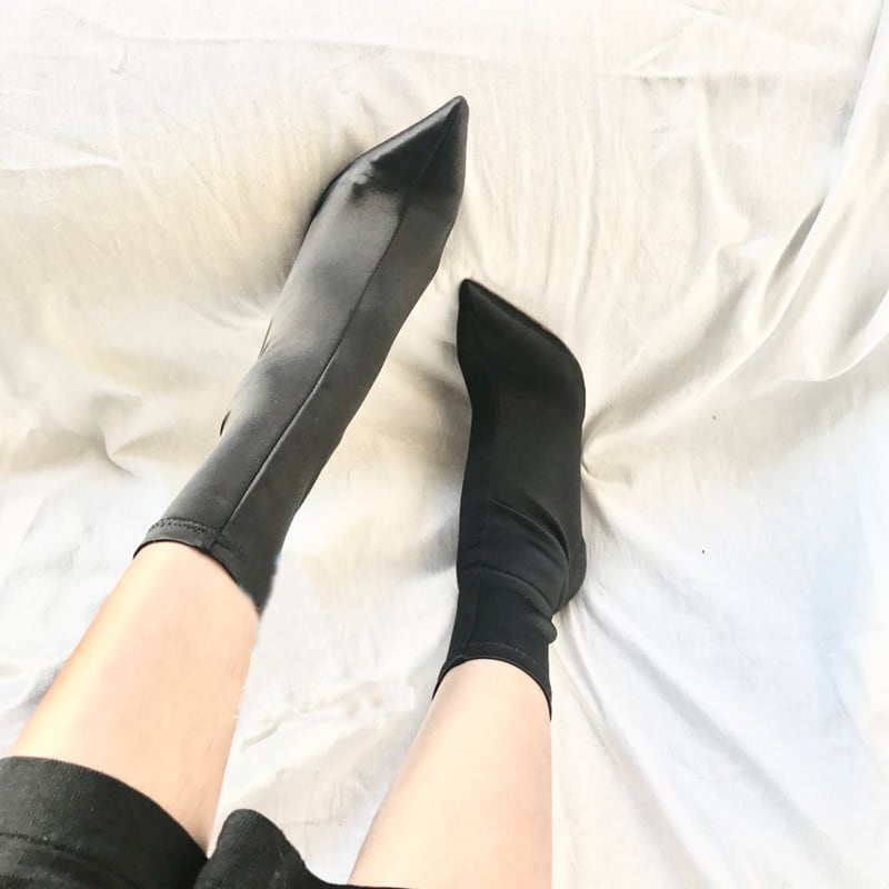 光沢感のあるしなやかなレザー生地で作られたポインテッドトゥのソックスブーツ。