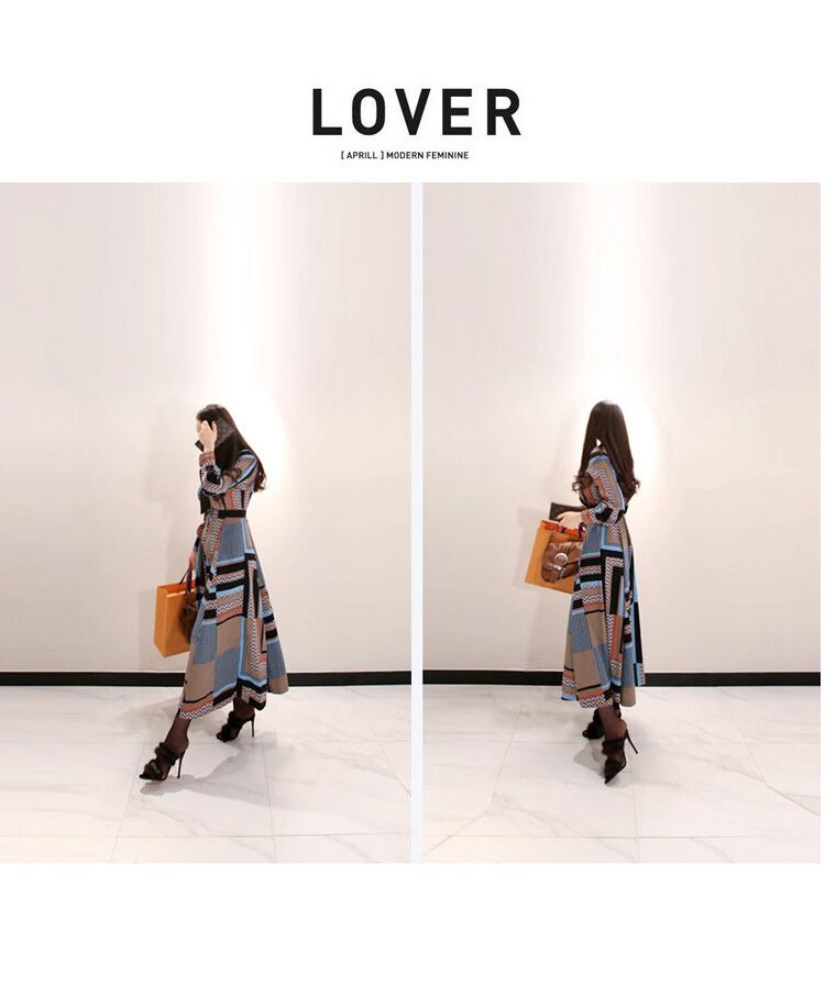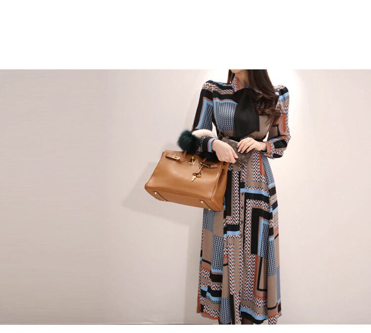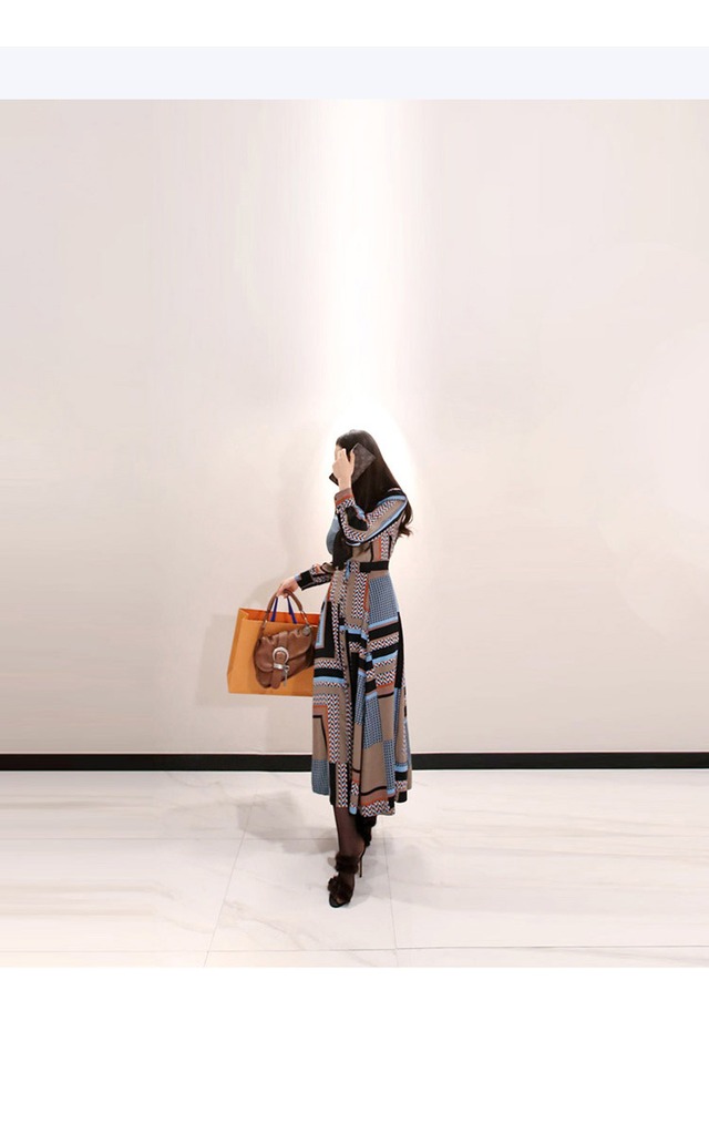 幾何学柄ワンピース ロング ロング丈 袖あり 長袖 襟付き プリンセス プリンセスライン フレア ウエストマーク ポリエステル 大人可愛い シンプル 上品 おしゃれ お洒落 かっこいい レトロ アジアン きれいめ 柄 10代 20代 30代 韓国系 オルチャン ファッション コーデ S M L XL
