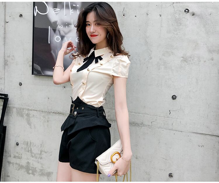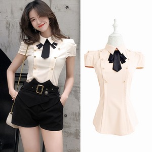 トップス ブラウス 白トップス 袖あり 半袖 パフスリーブ 襟付き リボン ファスナー ポリエステル かわいい おしゃれ お洒落 ラブリー キュート ガーリー 主役級 夏 10代 20代 デート 女子会 パーティー イベント 韓国 韓国系 オルチャン ファッション コーデ S M 白 ホワイト
