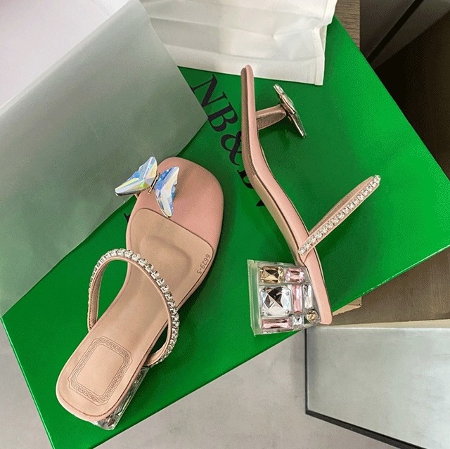 華やかな蝶のモチーフと輝くラインストーンが魅力のクリアサンダル。