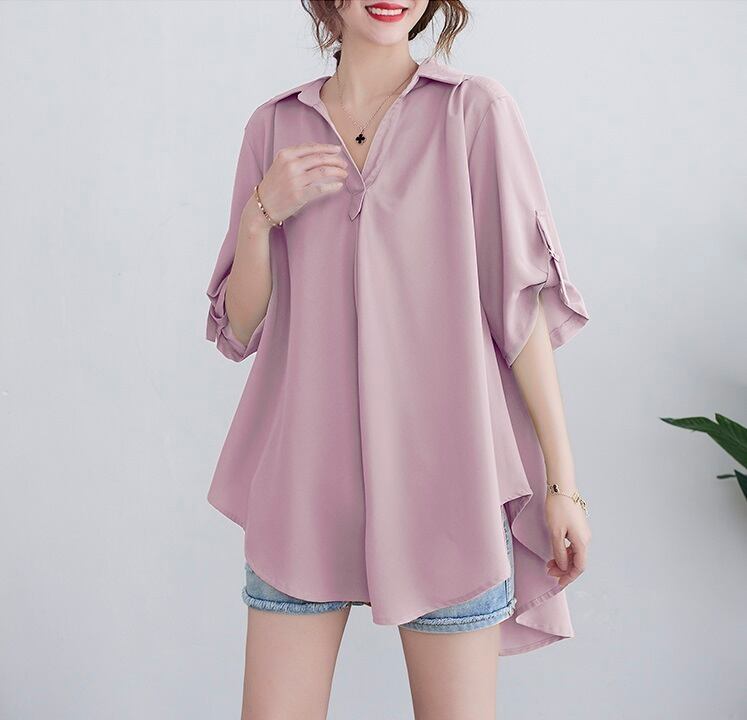 5分袖 スキッパー オーバー シャツ レディース トップス ミディアム アシンメトリー 丈長 半袖 Vネック 襟付き 角襟 ドレープ オーバーサイズ フィッシュテール タック かわいい 大人可愛い きれいめ シンプル カジュアル おしゃれ こなれ感 ルーズ 無地 春 夏 ママ マタニティ 通勤 学生 学校 通学 デート お出かけ 旅行 公園 女子会 休日 重ね着 韓国 楽ちん 体型カバー 普段使い 着回し レイヤード ロールアップ ゆったり フリーサイズ 白 ホワイト 黒 ブラック 黄色 イエロー ピン