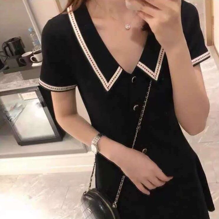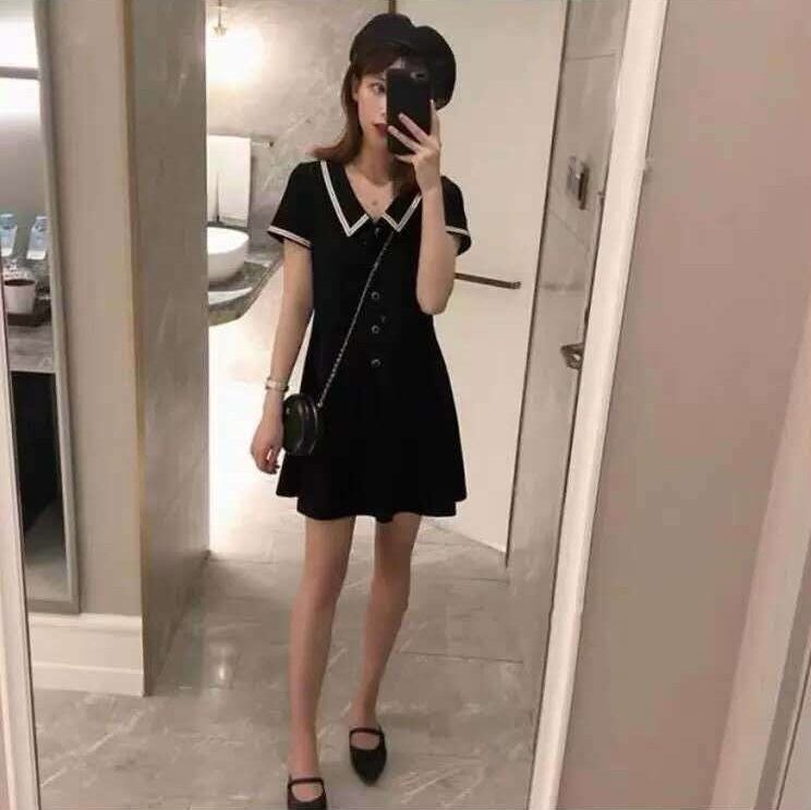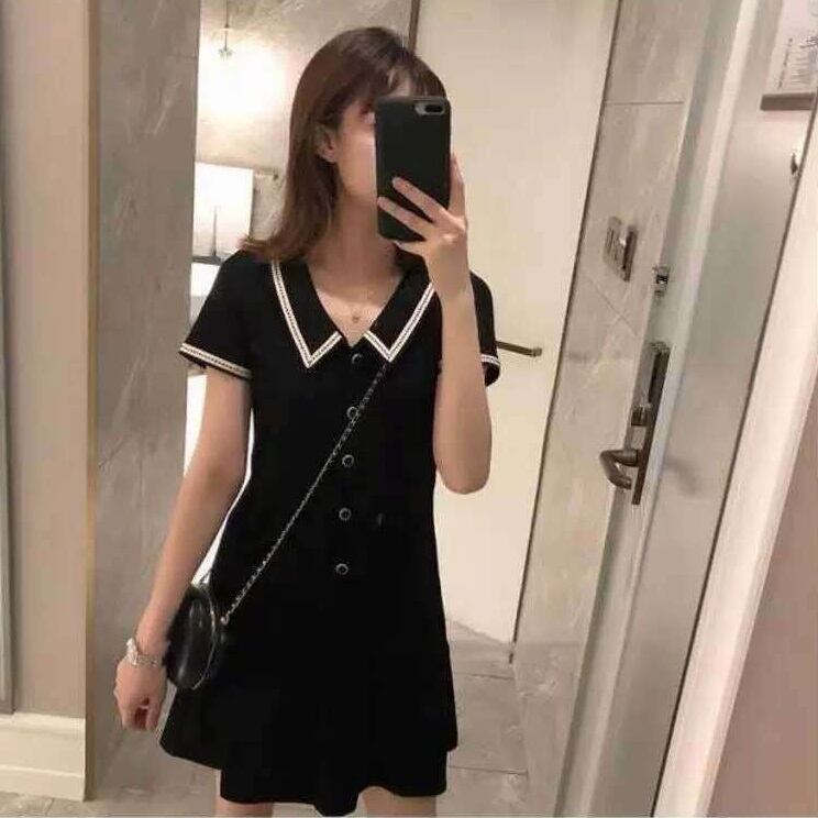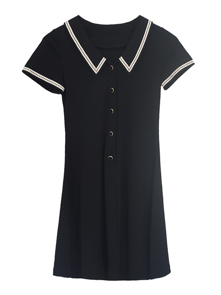 襟付き フロントボタン 半袖 ミニワンピース レディース ワンピース ミニ 膝上 Vネック 角襟 フレア スリム 細身 Aライン ボタン バイカラー 配色 かわいい 大人可愛い シンプル カジュアル おしゃれ ガーリー 無地 春 夏 通勤 学生 学校 通学 デート お出かけ 旅行 女子会 休日 韓国 普段使い 着回し S M L XL 黒 ブラック モノトーン