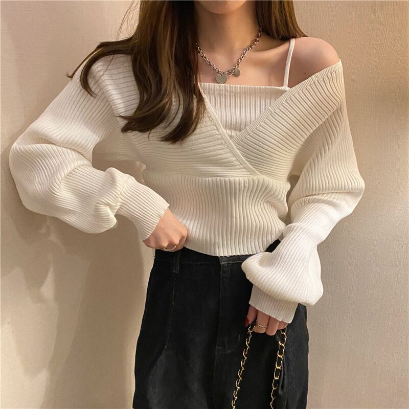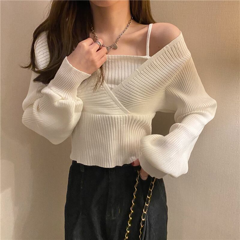 重ね着風 ショート丈 リブニット トップス レディース ニット セーター キャミソール ショート 長袖 Vネック カシュクール 襟なし スリム 細身 切り替え リブ 切り替えデザイン かわいい 大人可愛い きれいめ シンプル カジュアル おしゃれ 無地 春 秋 通勤 学生 学校 通学 デート お出かけ 旅行 女子会 休日 重ね着 韓国 オルチャン 普段使い 着回し レイヤード フリーサイズ 白 ホワイト 黒 ブラック 茶色 ブラウン ピンク レッド 大人カラー