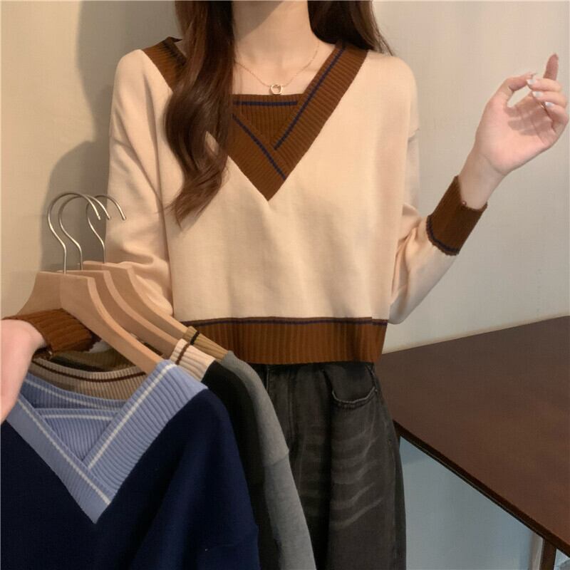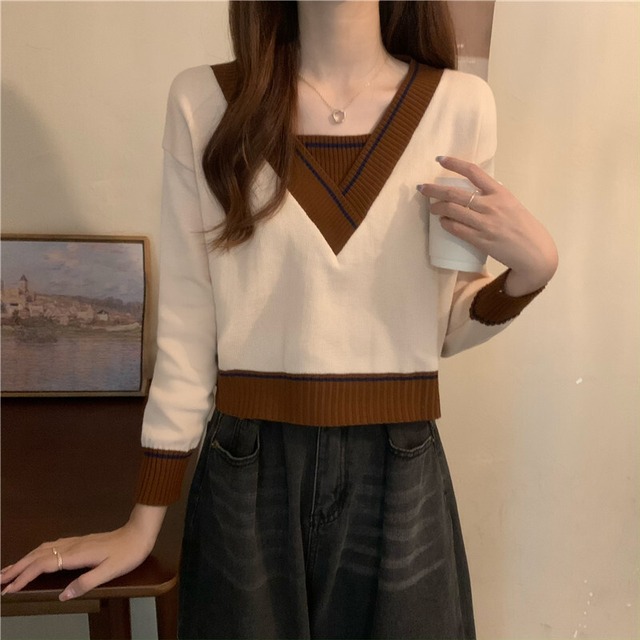 重ね着風 Vネック ニットセーター レディース トップス ニット セーター ミディアム 長袖 Vネック カシュクール 襟なし リブ リブニット バイカラー 配色 かわいい 大人可愛い シンプル カジュアル おしゃれ こなれ感 無地 春 秋 通勤 学生 学校 通学 デート お出かけ 旅行 公園 女子会 休日 重ね着 韓国 オルチャン プチプラ 普段使い 着回し レイヤード S M L XL 黒 ブラック グレー アプリコット ネイビー 大人カラー