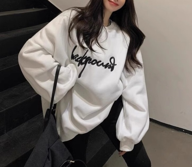 英字 ロゴ オーバーサイズ トレーナー レディース トップス プルオーバー 長袖 ドロップショルダー ラウンドネック 襟なし 中厚手 厚手 裏起毛 かわいい 大人可愛い シンプル カジュアル おしゃれ こなれ感 ルーズ 春 秋 冬 ママ 通勤 学生 学校 通学 デート お出かけ 旅行 公園 女子会 休日 ショッピング カフェ モノトーン 重ね着 韓国 楽ちん 暖かい 体型カバー 普段使い 着回し レイヤード S M L XL 2XL 大きいサイズ ゆったり ゆる 白 ホワイト 黒 ブラック