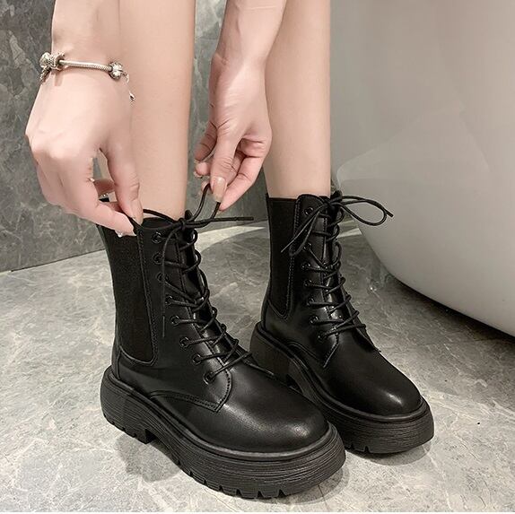 エッジの効いたスタイルを演出するマットな質感とシャイニーな表面が特徴の、レザーレースアップショートブーツです。ミドルヒールの厚底により、美脚効果も期待できます。シンプルなデザインながら、大人可愛い雰囲気とクールな印象を持ち合わせており、様々なスタイルに合わせやすいです。カジュアルからおしゃれなコーディネートまで、幅広いシーンで活躍してくれて、通勤や通学、デート、お出かけ、旅行など様々な場面で活用できます。デイリーユースに最適なアイテムで、休日や普段使いにおすすめです。サイズ展開も豊富で、22.5cmから25.0cmまで幅広いサイズに対応しています。カラーはクラシックでありながら、他の色とのコーディネートもしやすいブラックをご用意しています。この一足で、素敵な足元を演出しませんか。