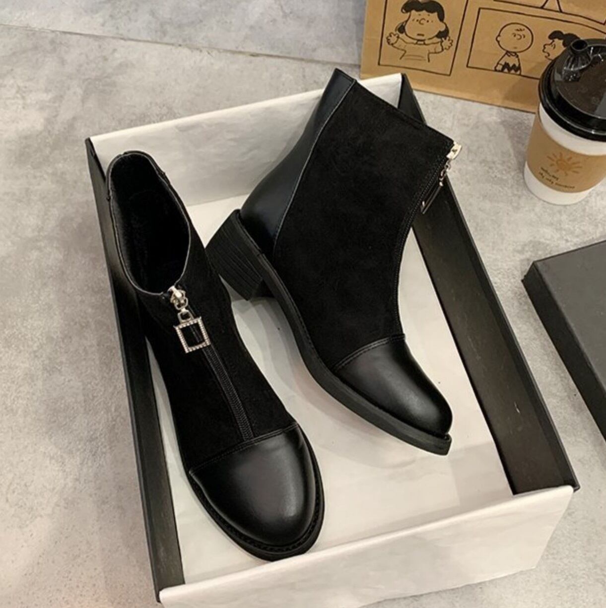 フロントファスナーPUレザーショートブーツが登場しました!足元をおしゃれに彩るアイテムとして、幅広いコーディネートにマッチするデザインとなっております。太ヒールで安定感も抜群で、歩きやすさも追求しました。