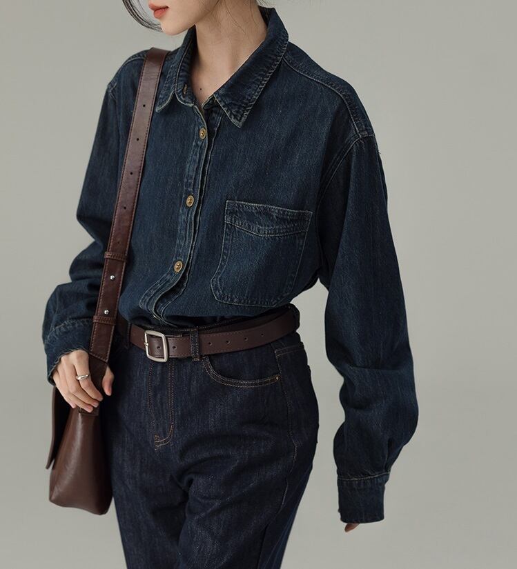 デニム ルーズ シャツ レディース トップス 丈長 長袖 ドロップショルダー 襟付き 角襟 ポロカラー 前開き ボタン かわいい 大人可愛い シンプル カジュアル おしゃれ レトロ こなれ感 マニッシュ ルーズ 無地 春 秋 ママ 通勤 デート お出かけ 旅行 公園 女子会 休日 ショッピング カフェ 重ね着 体型カバー 普段使い 着回し レイヤード 定番 S M L ゆったり ネイビー