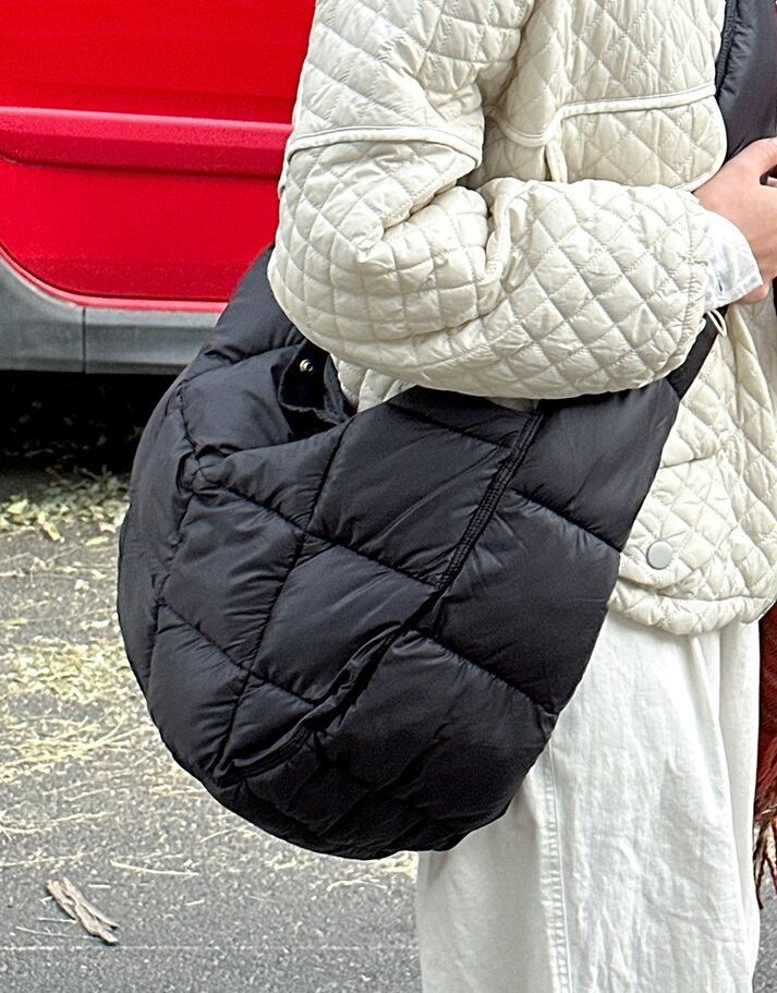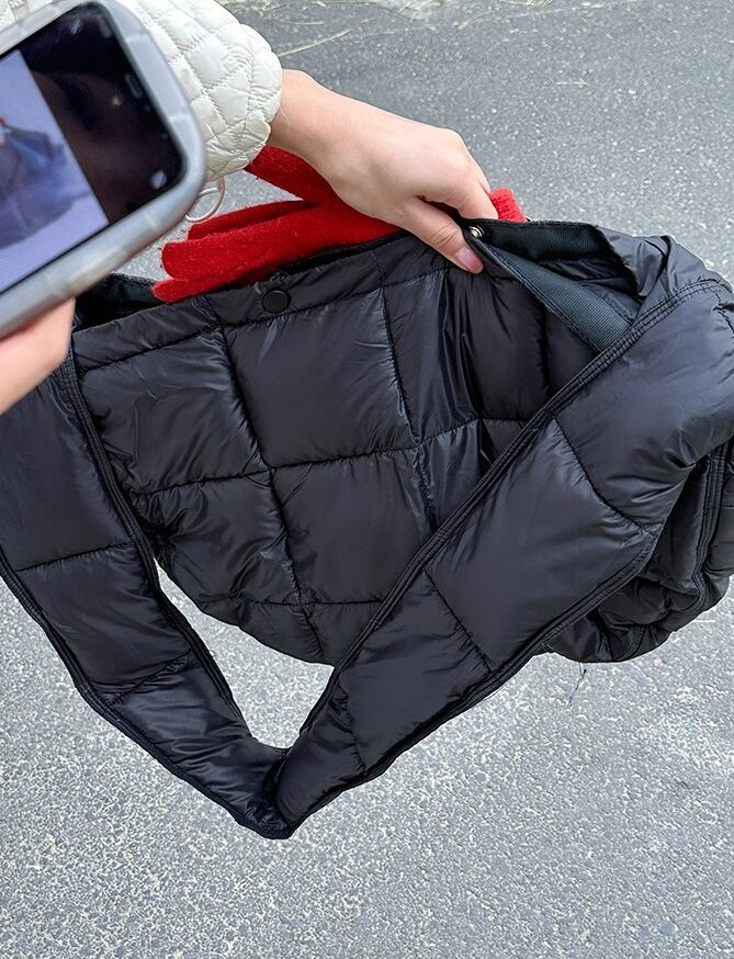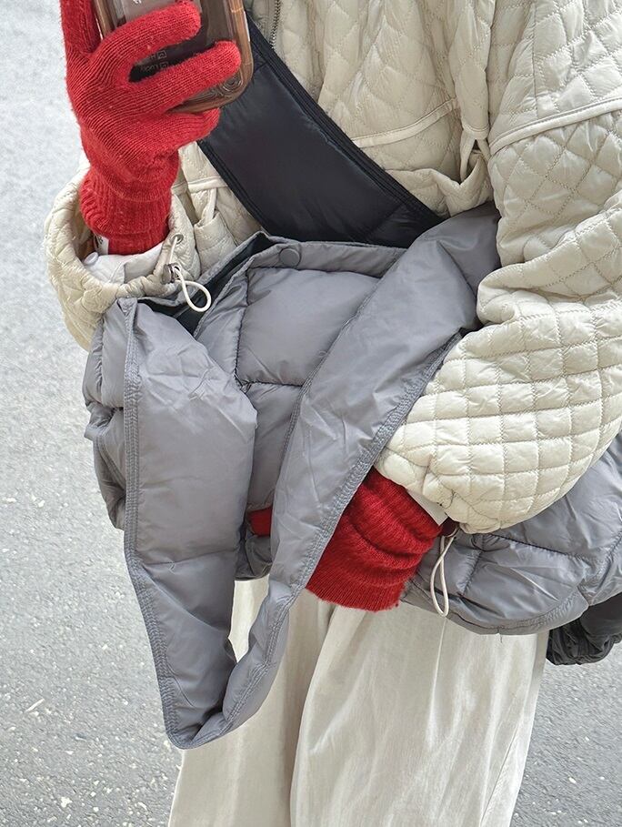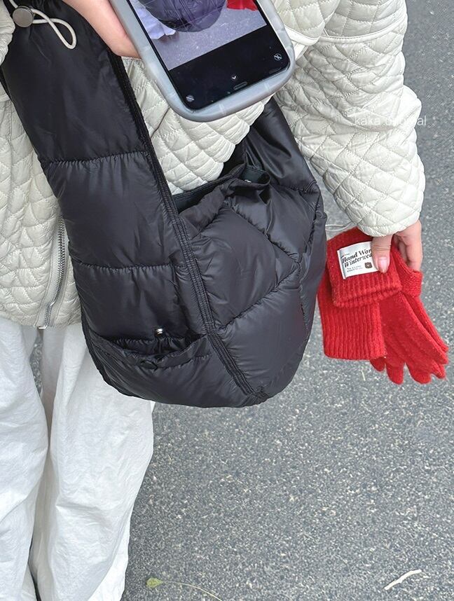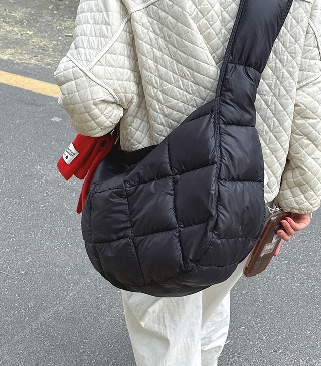 素材は軽くて丈夫なナイロン素材を使用しており、長時間持ち運ぶのにも安心です。カジュアルなコーディネートにぴったりな黒やグレー、オフホワイトの無地カラーが選べます。季節やシーンを問わず、大人可愛いキルティングバッグをお楽しみください。