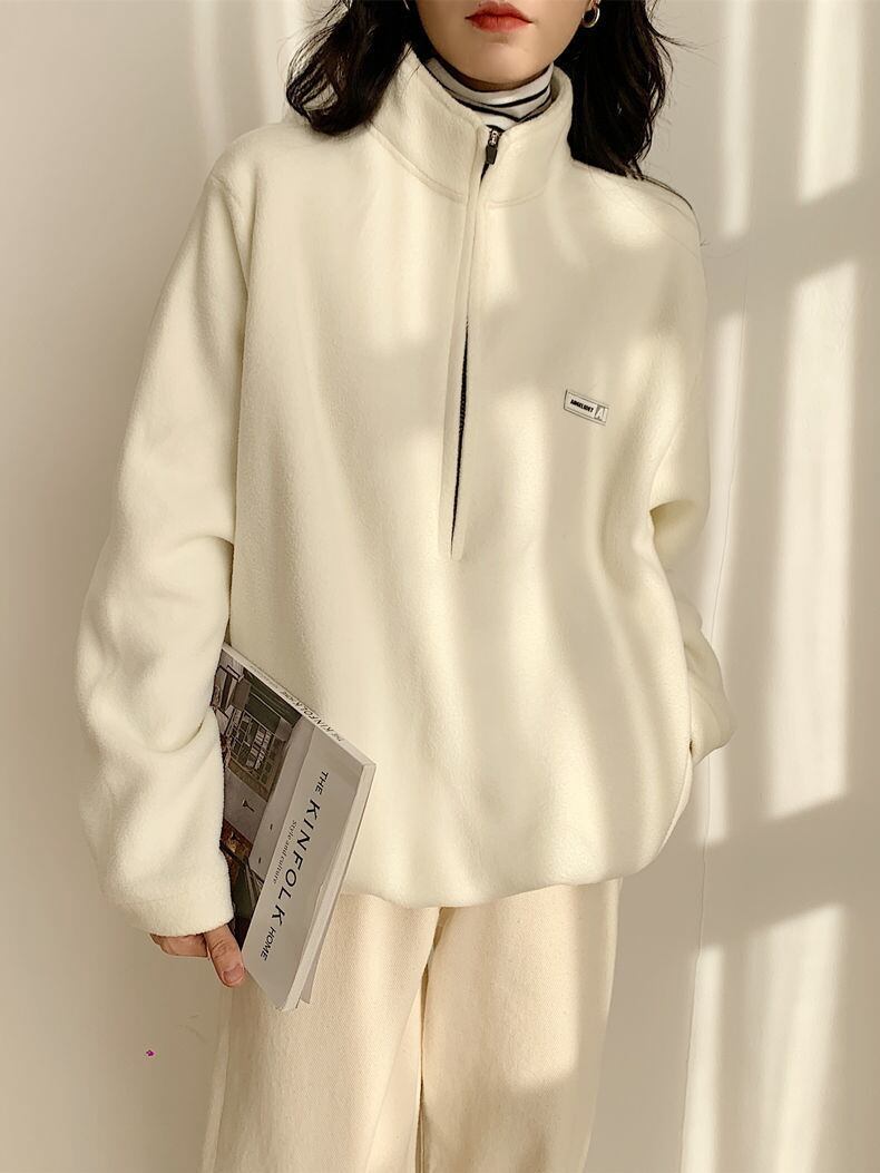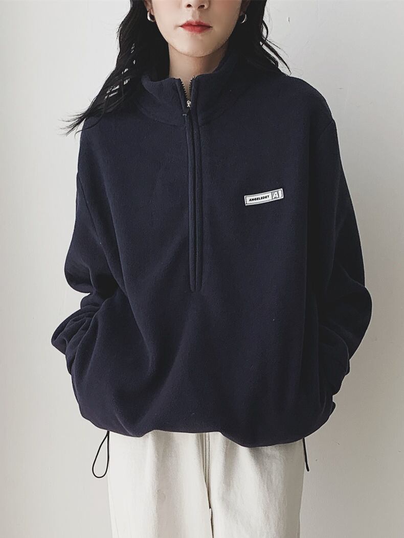 ハーフジップ スタンドカラー スウェット トレーナー レディース トップス プルオーバー 丈長 長袖 もこもこ ファスナー ポケット かわいい 大人可愛い シンプル カジュアル おしゃれ かっこいい こなれ感 ルーズ ロゴ 春 秋 冬 ママ 通勤 学生 学校 通学 デート お出かけ 旅行 公園 女子会 休日 ショッピング カフェ 重ね着 楽ちん 暖かい 体型カバー 普段使い 着回し レイヤード S M L XL 2XL 3XL 4XL 大きいサイズ ゆったり 黒 ブラック ベージュ ネイビー