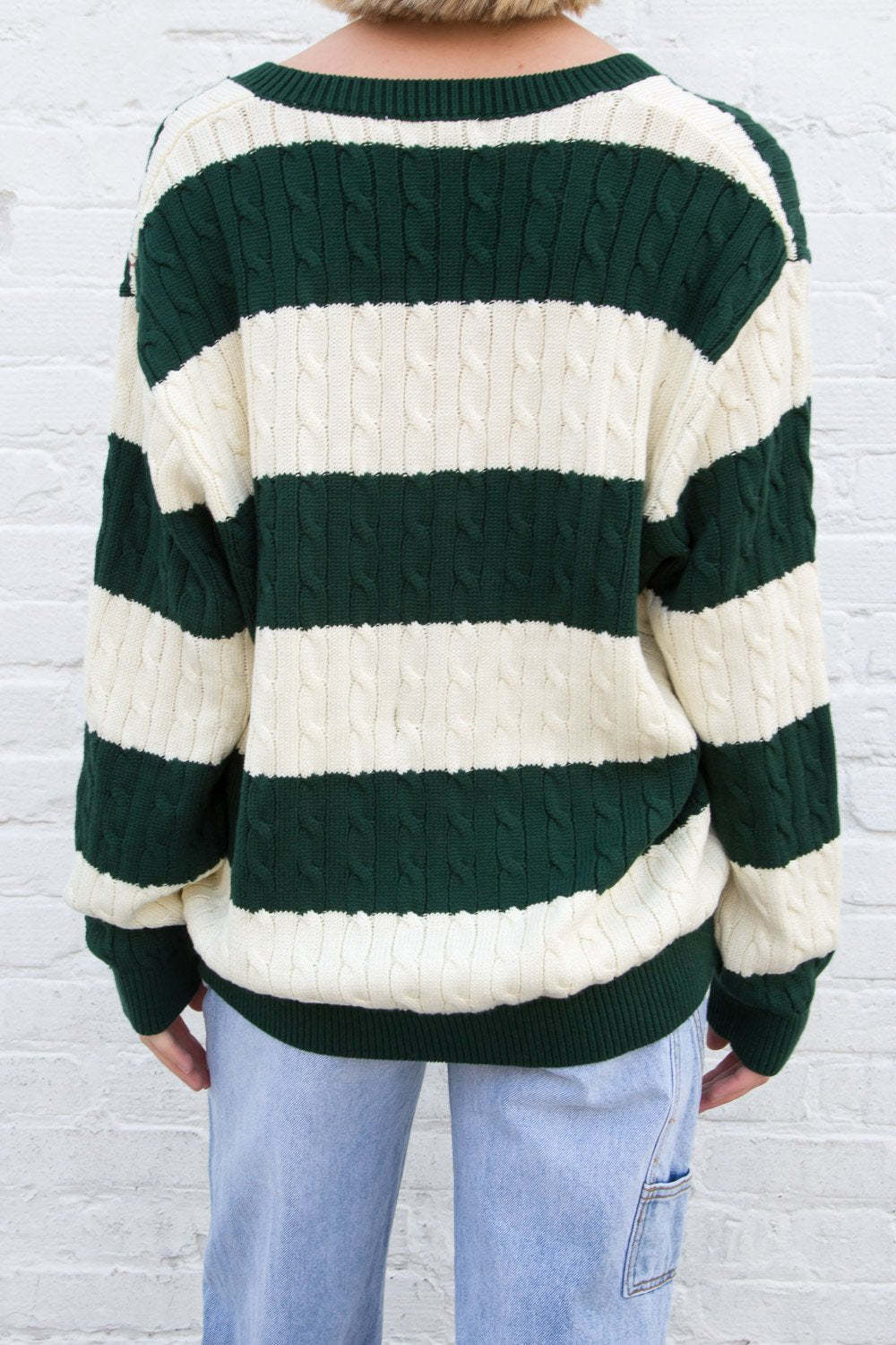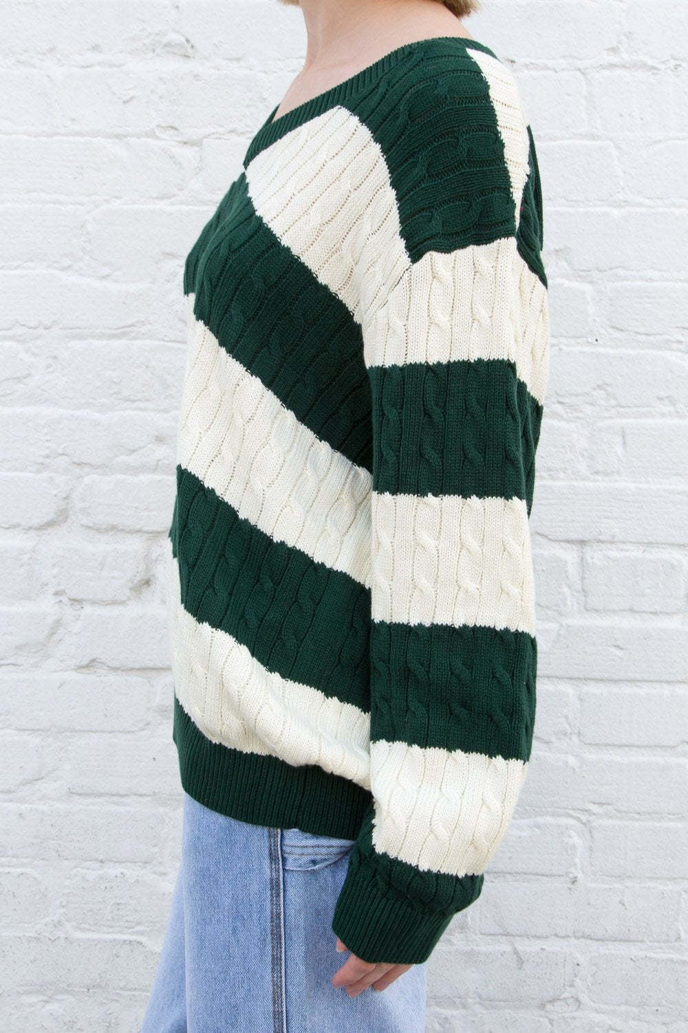 暖かい季節にぴったりのボーダー柄Vネックケーブル編みニットセーター。その存在感と個性的なデザインで、どんなシーンでもおしゃれ度をアップさせます。ドロップショルダーと長めの丈が、体型をカバーしながらもスタイルよく見せてくれます。