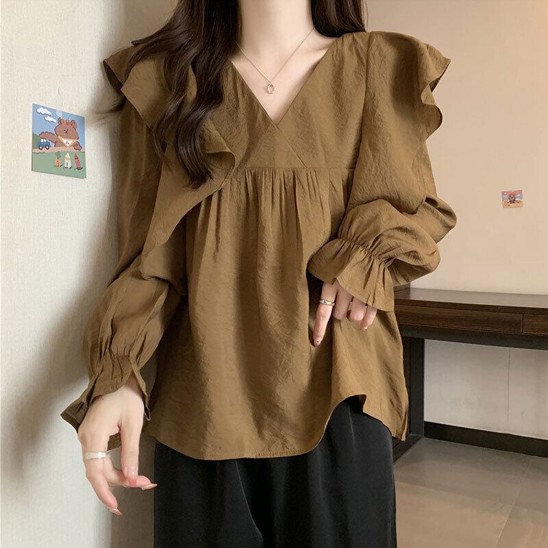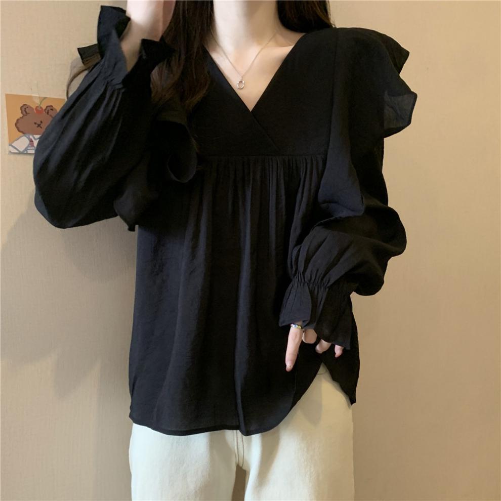 Vネック フリル シャツ ブラウス レディース トップス プルオーバー 長袖 フレアスリーブ カシュクール 襟なし フレア 切り替え フェミニン ハイウエスト かわいい 大人可愛い きれいめ シンプル カジュアル おしゃれ ルーズ 無地 春 秋 冬 ママ 通勤 学生 学校 通学 デート お出かけ 旅行 公園 女子会 休日 ショッピング カフェ 楽ちん 体型カバー 普段使い 着回し M L XL 2XL 3XL 4XL 大きいサイズ ゆったり 黒 ブラック アプリコット キャメル