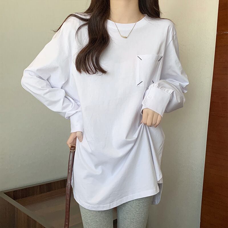 シャツデザイン ポケット付き ラウンドネック ロンT レディース トップス カットソー プルオーバー インナー Tシャツ 丈長 長袖 襟なし スリット サイドスリット ポケット ボタン 綿 かわいい 大人可愛い きれいめ シンプル カジュアル おしゃれ こなれ感 ルーズ 無地 春 秋 冬 ママ 通勤 学生 学校 通学 デート お出かけ 旅行 公園 女子会 休日 ショッピング カフェ 重ね着 体型カバー 普段使い 着回し レイヤード S M L XL ゆったり 白 ホワイト 黒 ブラック カーキ